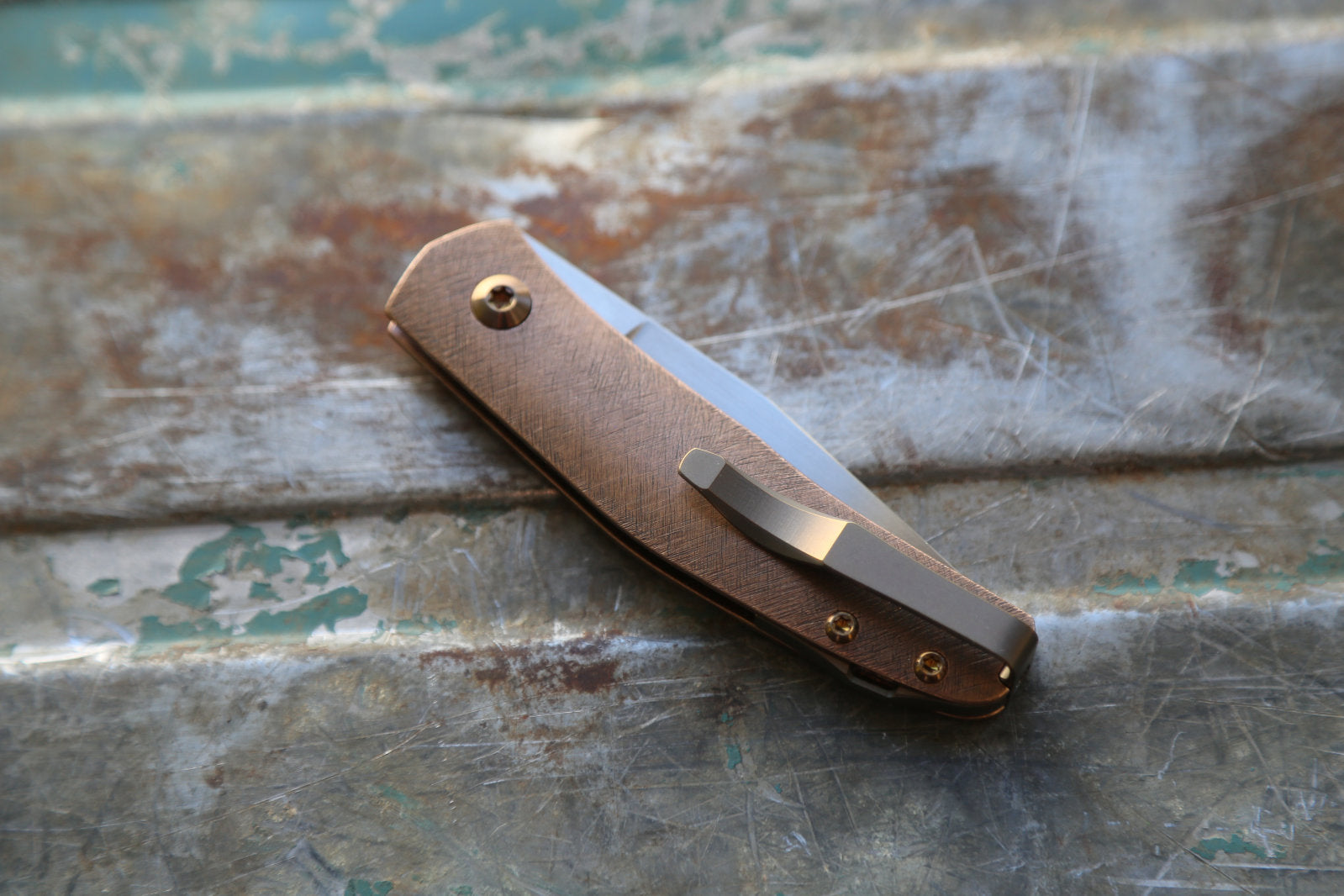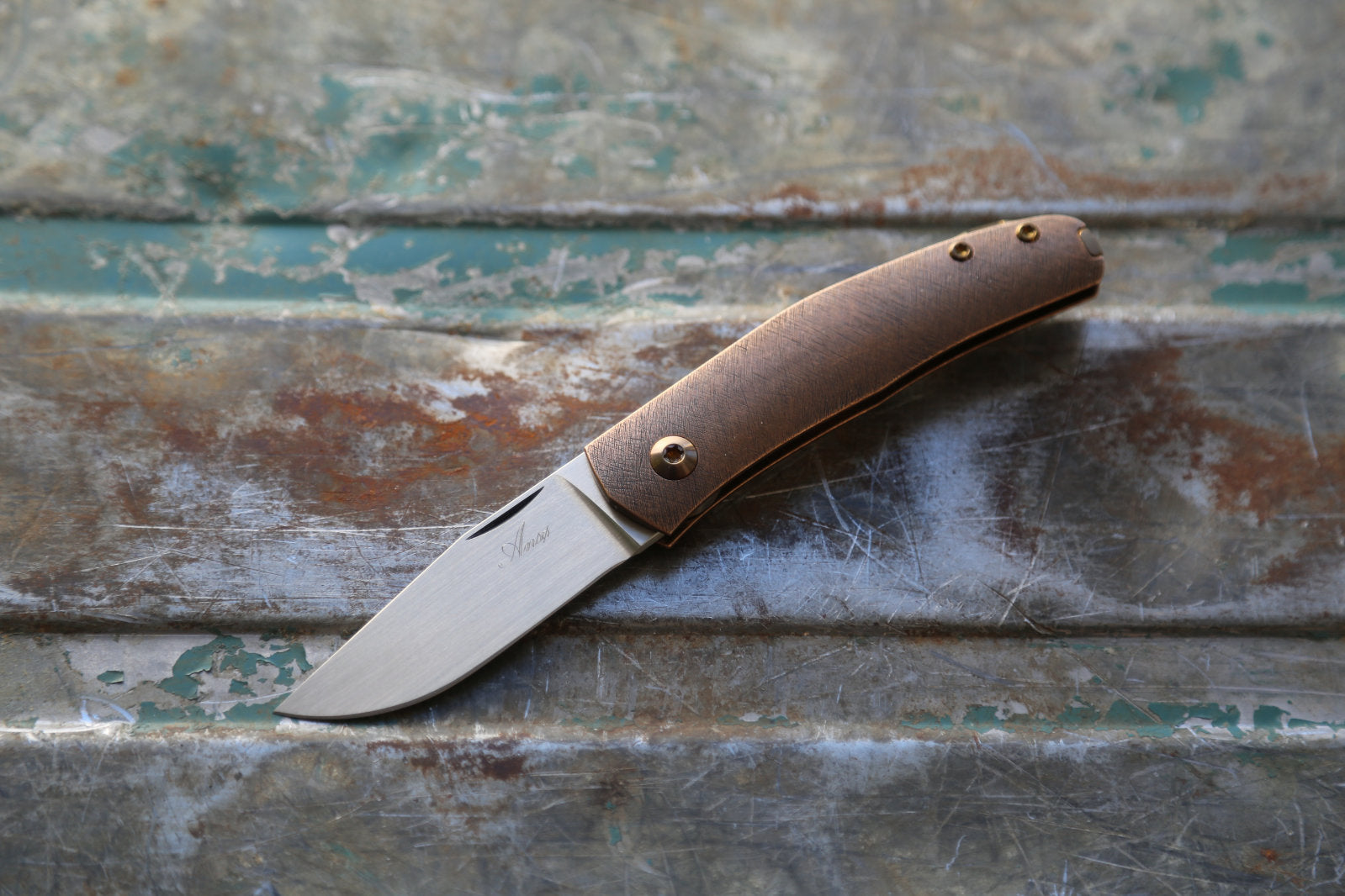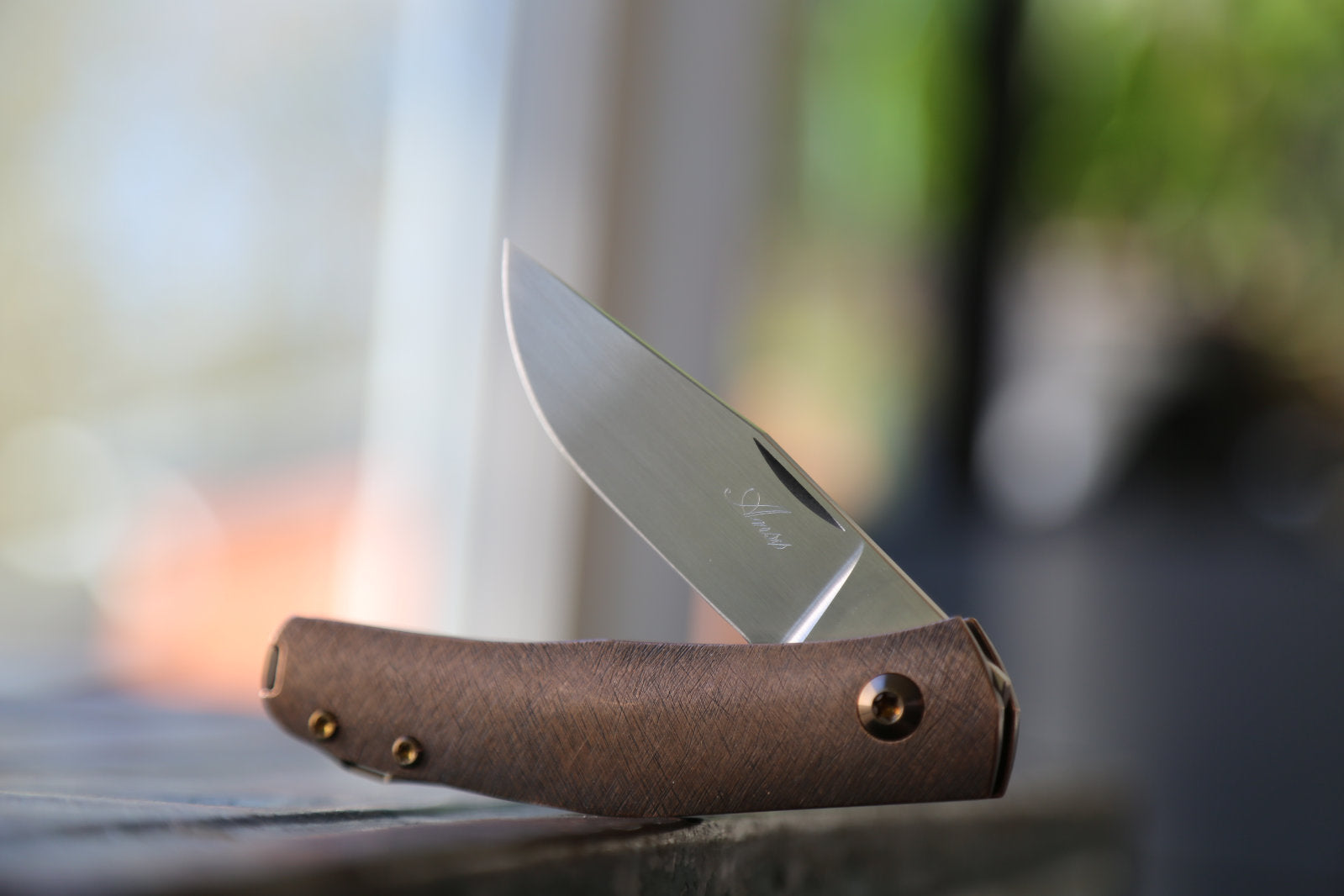 This Casino is made with an experimental scratch pattern texture on the Bronze handle. This is a technic I have been exploring for years and is inspired by traditional Japanese metal work. This gives it a very unique feel and looks. The blade is made from RWL34. Clip and spacer are Amber with amber screws.