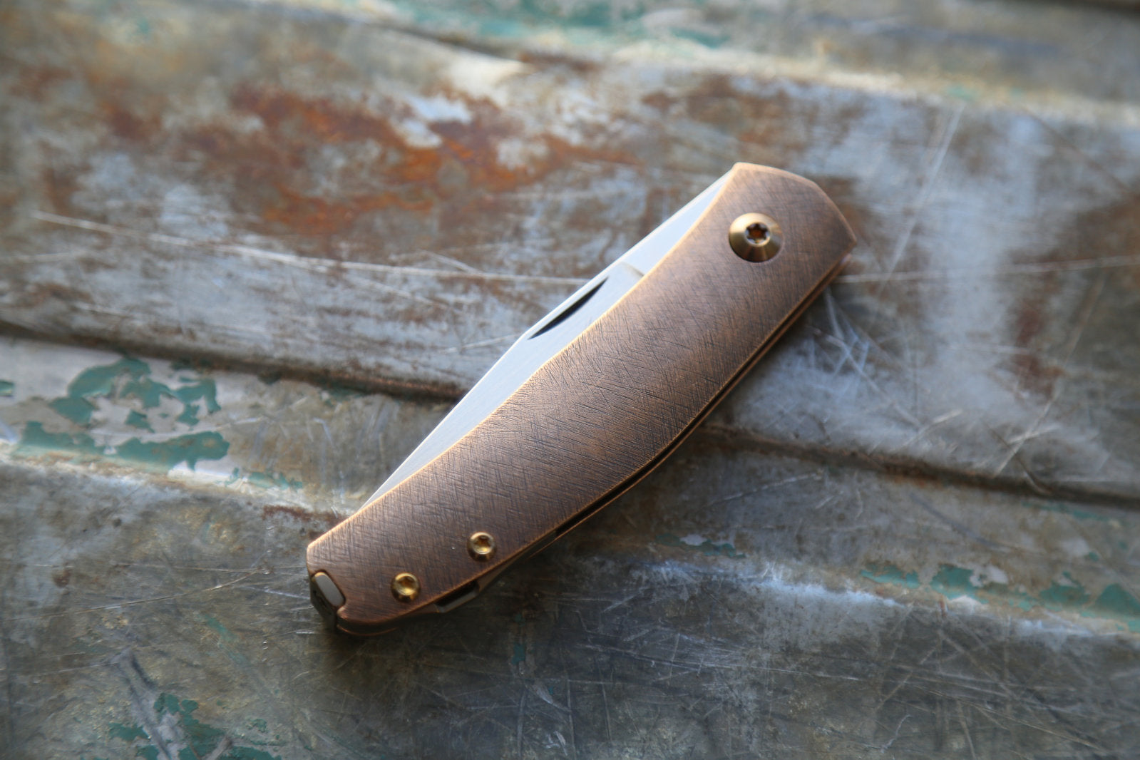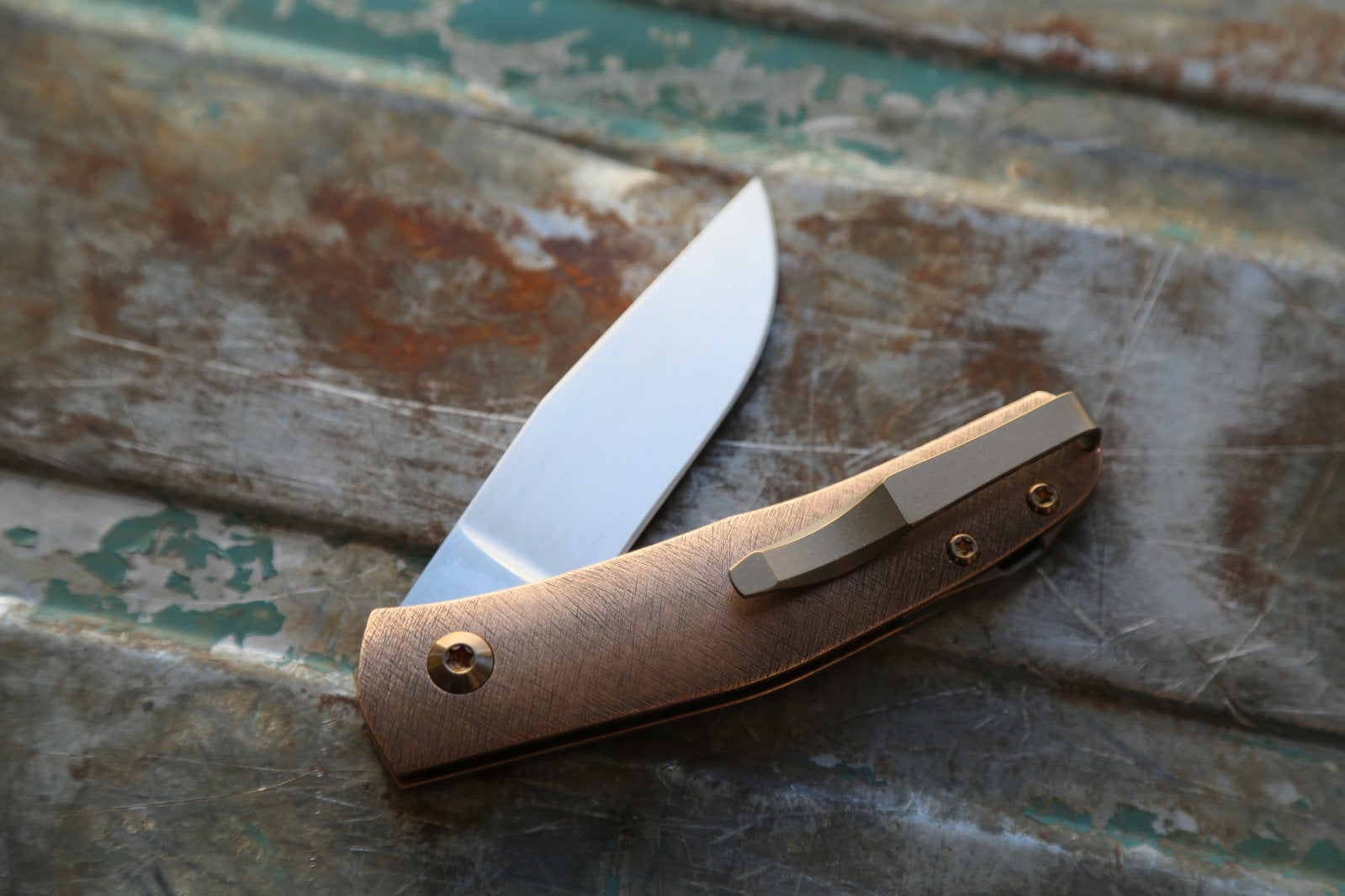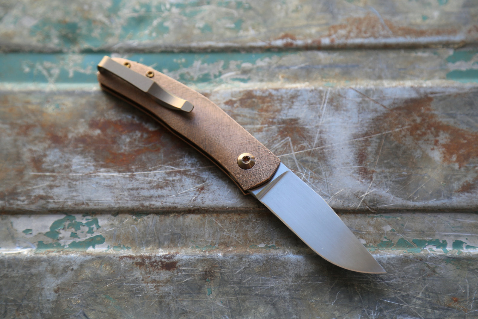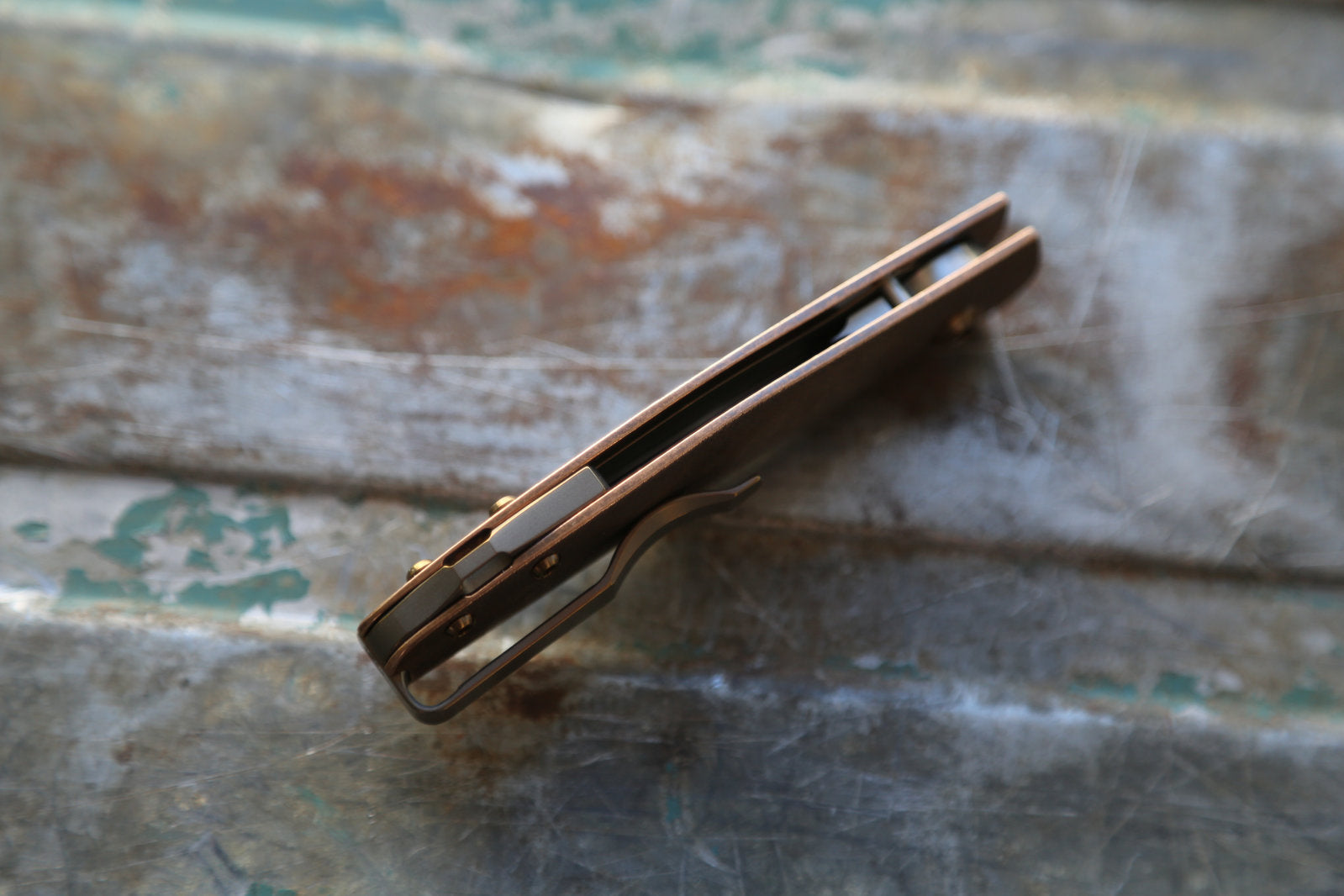 This Casino is made with an experimental scratch pattern texture on the Bronze handle. This is a technic I have been exploring for years and is inspired by traditional Japanese metal work. This gives it a very unique feel and looks. The blade is made from RWL34. Clip and spacer are Amber with amber screws.