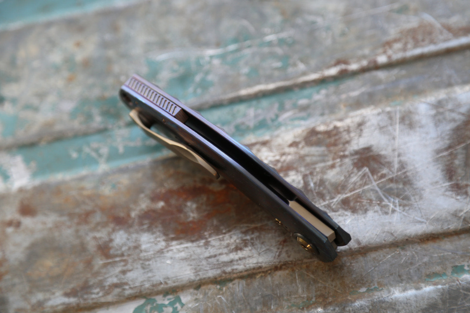 Here I revised the design. Brought it up to todays standards if you will. A few key elements in this build. Double swedge grind. Hardened steel lock insert. Titanium screws. Anso texture on the show side. Contoured lock side. Sculpted clip. Milled grooves in spacer.