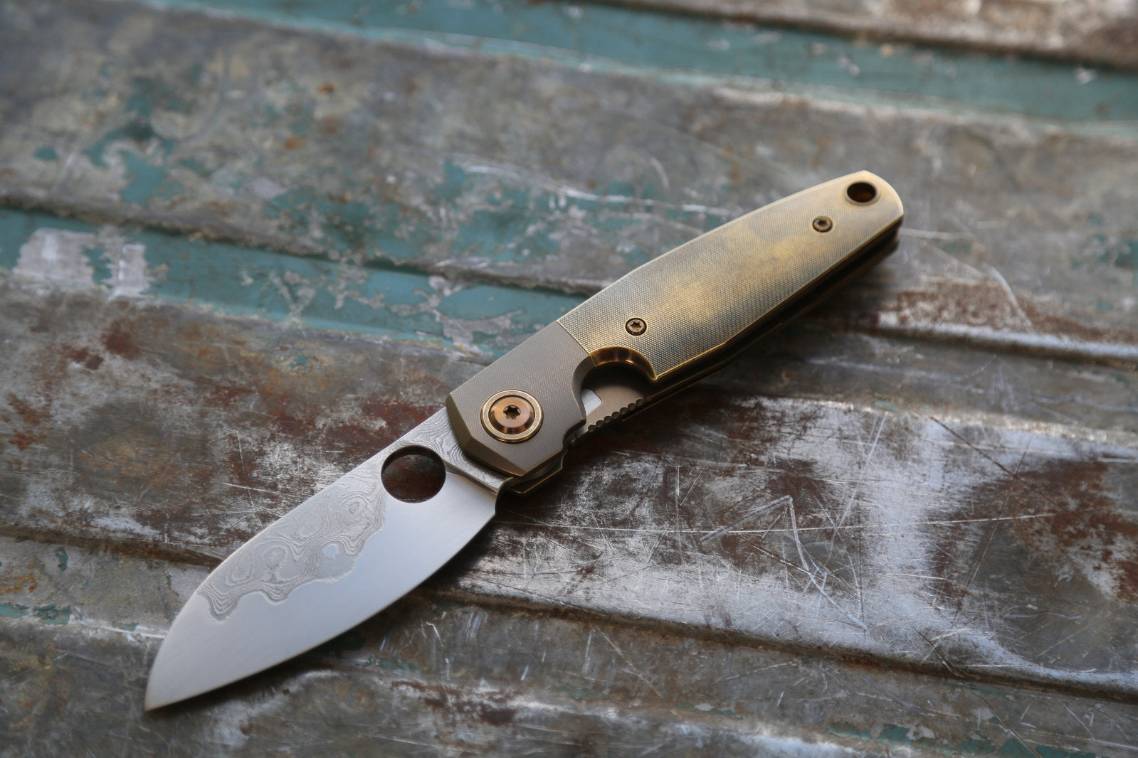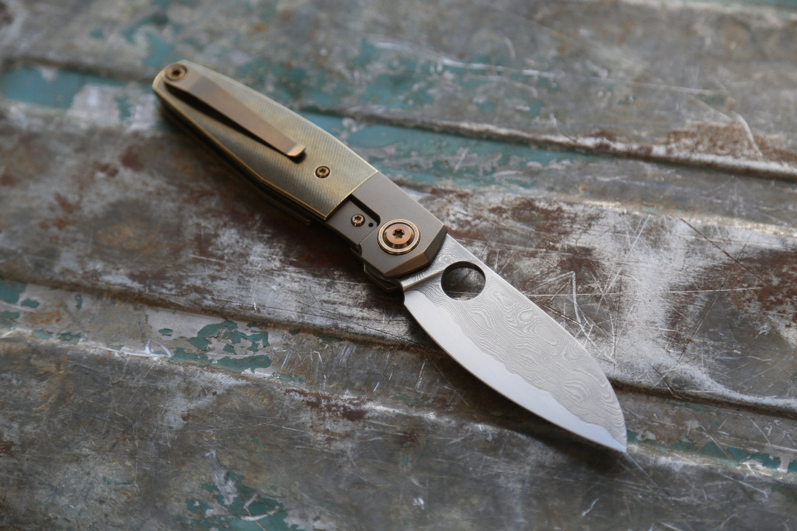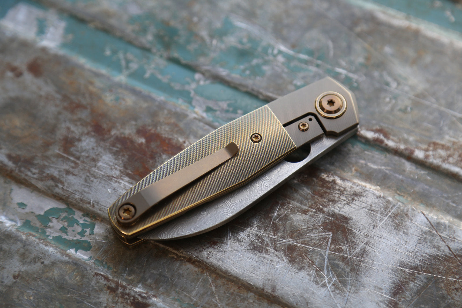 This particular Sonic features a Blade in Chad Nichols Armor Core Damascus with brass scales over an amber anodized titanium frame. The clip and titanium screws are anodized amber. Spacer and Pivot Rings are also Brass.