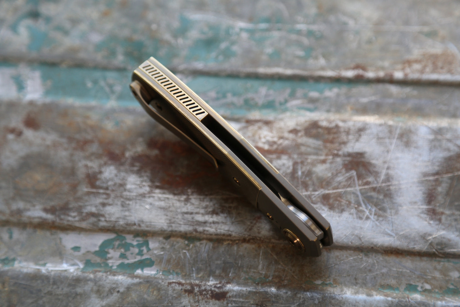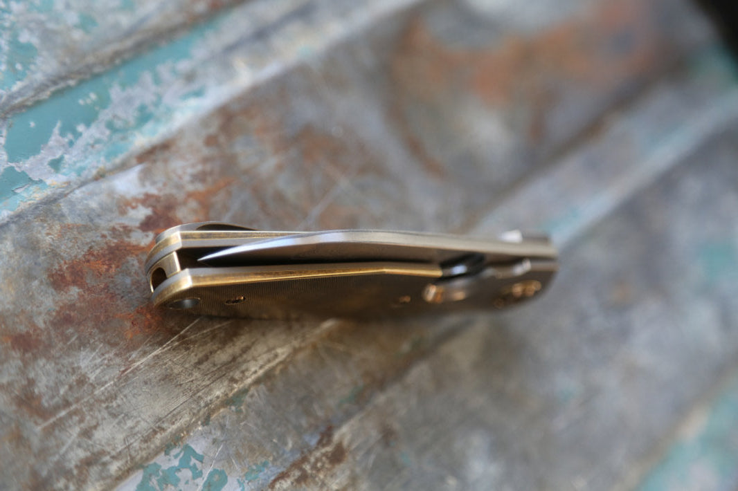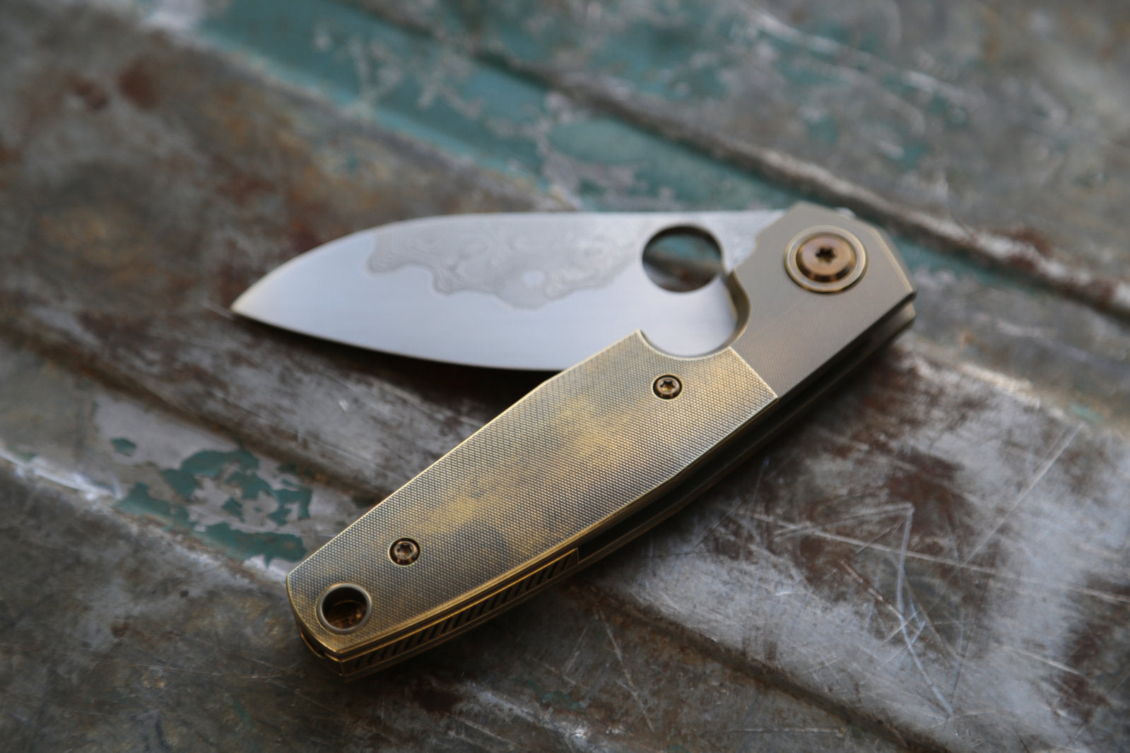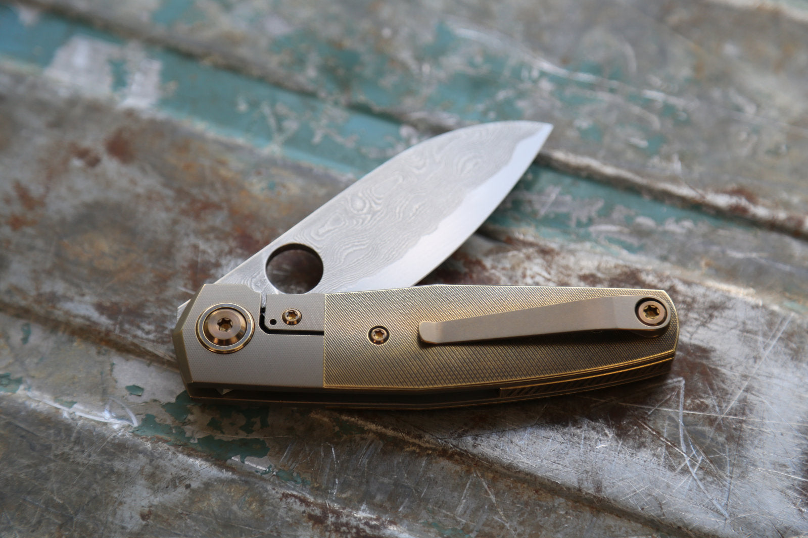 This particular Sonic features a Blade in Chad Nichols Armor Core Damascus with brass scales over an amber anodized titanium frame. The clip and titanium screws are anodized amber. Spacer and Pivot Rings are also Brass.