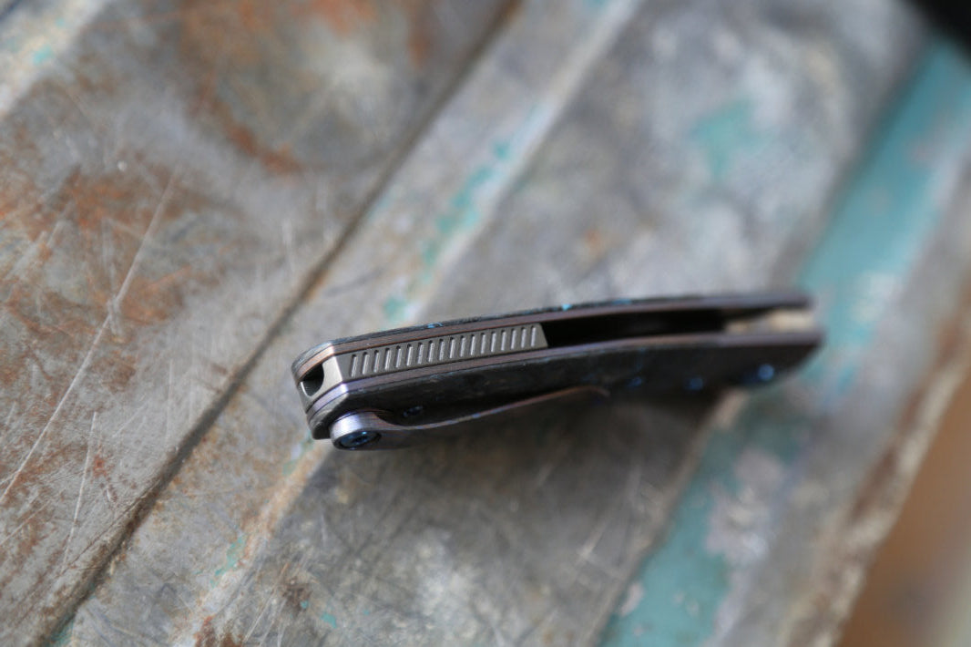 This particular Sonic features a Blade in handrubbed RWL34 with blue Dark Matter carbon fiber scales over frame in black timascus. The clip is black timascus and spacer and pivot rings are made from Zirconium. The titanium screws are anodized blue.