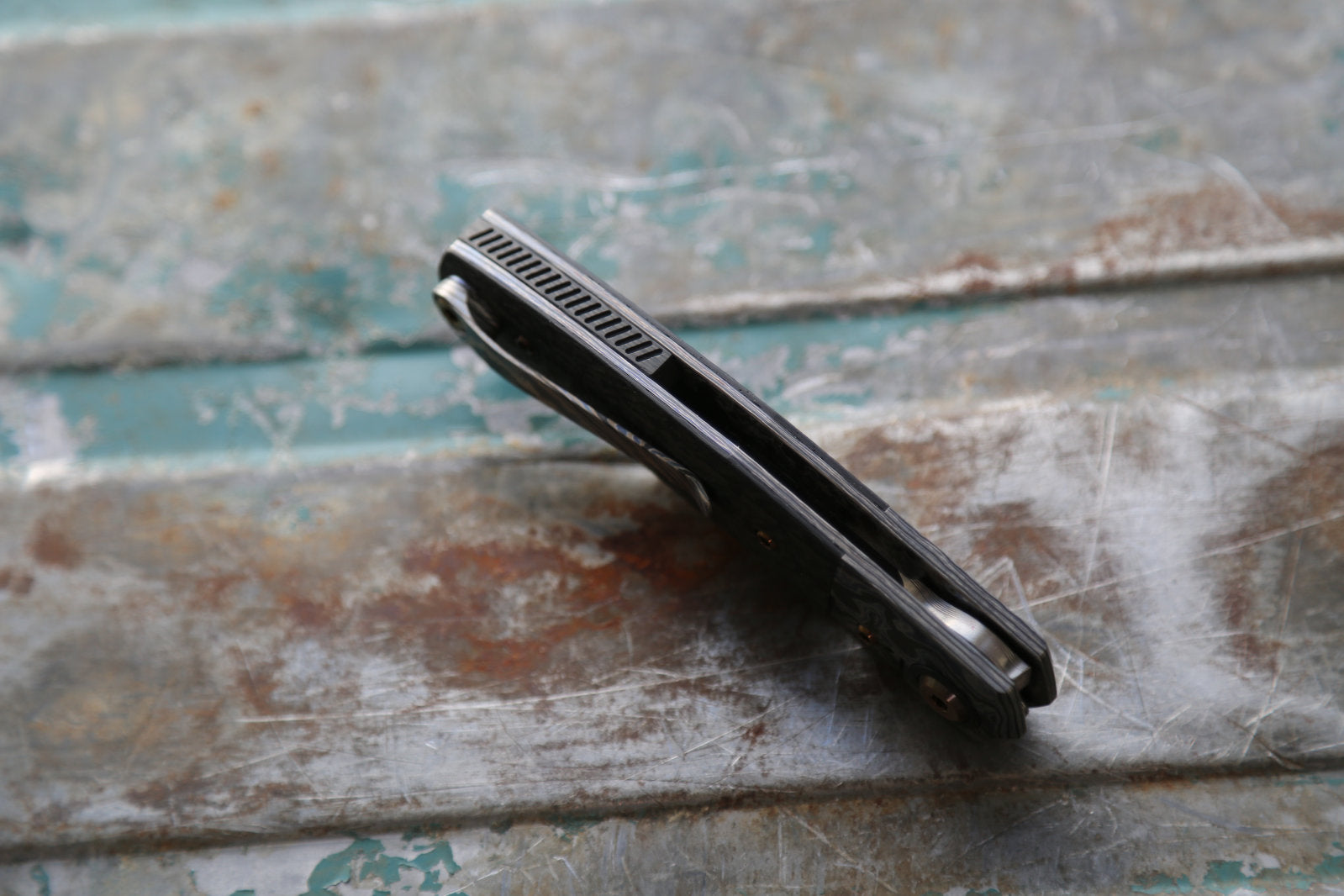 This particular Sonic features a Blade in Chad Nichols Armor Core Damascus with scales in F16 carbon fiber over an etched Black Timascus frame. Clip is black timascus and spacer and pivot rings are made from carbon fiber. The screws are anodized amber.
