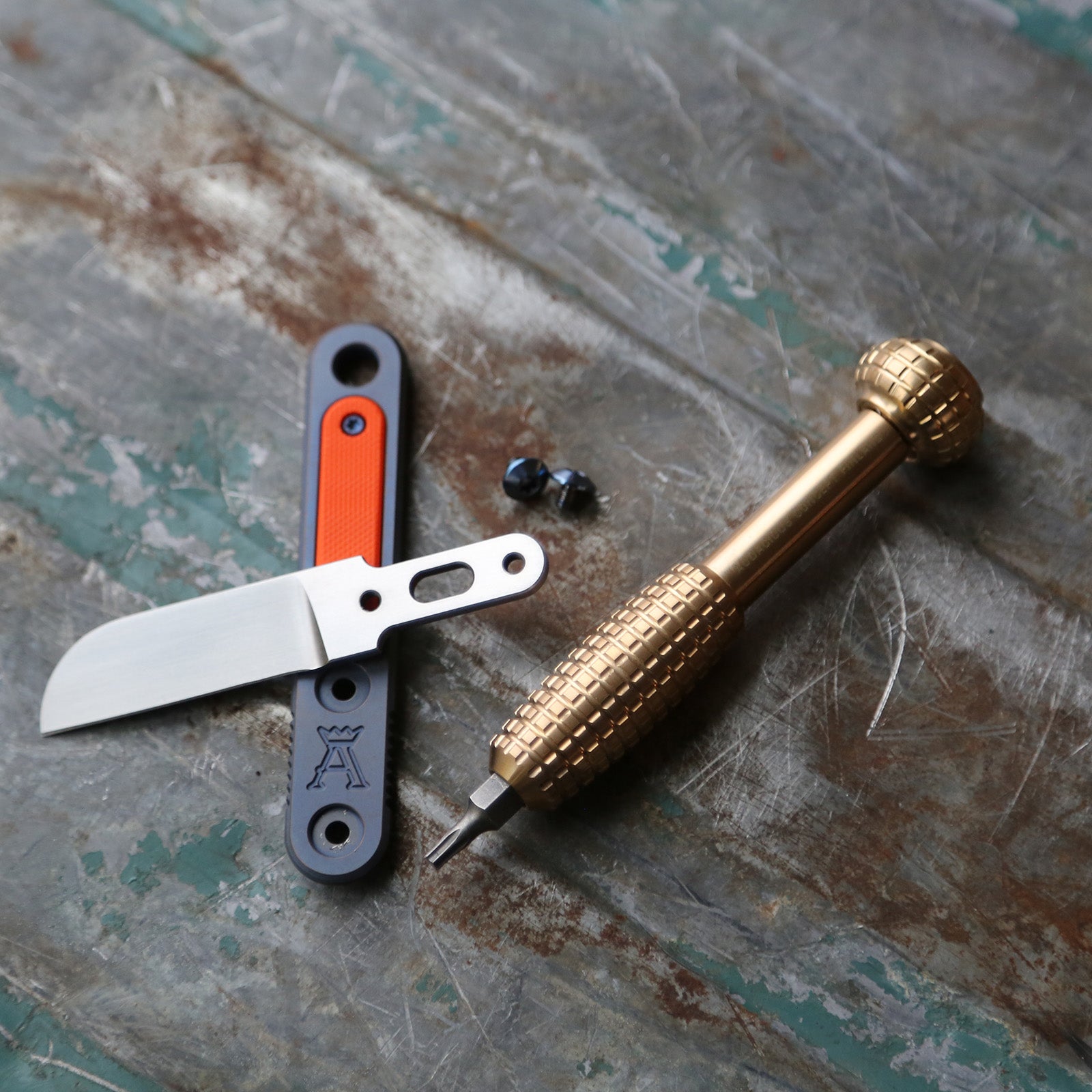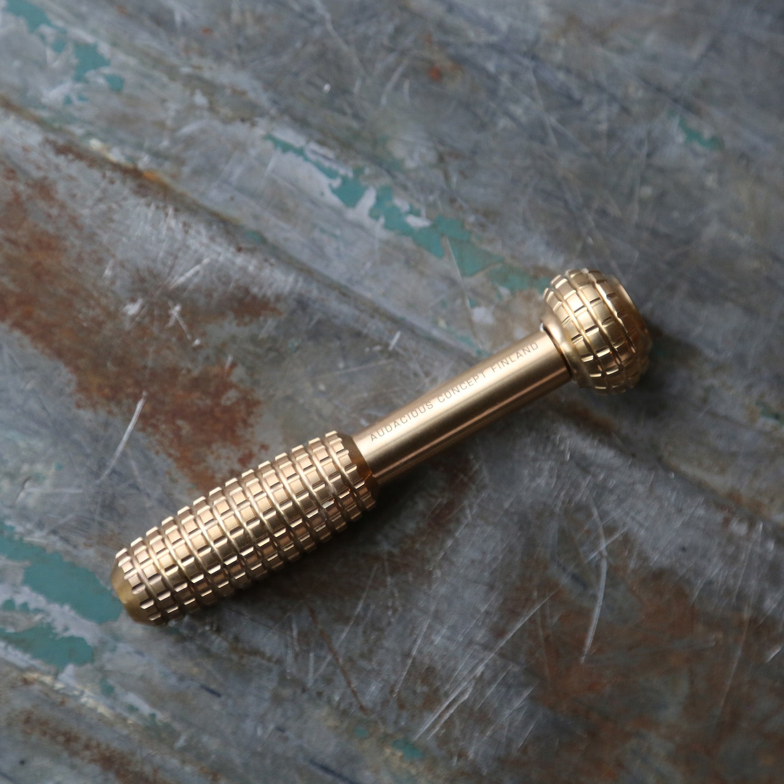 This version is limited and made from textured brass in a satin finish. It has a both secure and comfortable grip, that allows for both precision and torque. The spinning head sits on two precision bearings and rests well in the palm of your hand but also offers you to position your index finger tip for precision work. I have used spinning drivers for years in my shop for putting my knives together and these drivers are designed with this knowledge in mind. I designed this great little tool for Audcious Concepts in Finland, who had them made. .