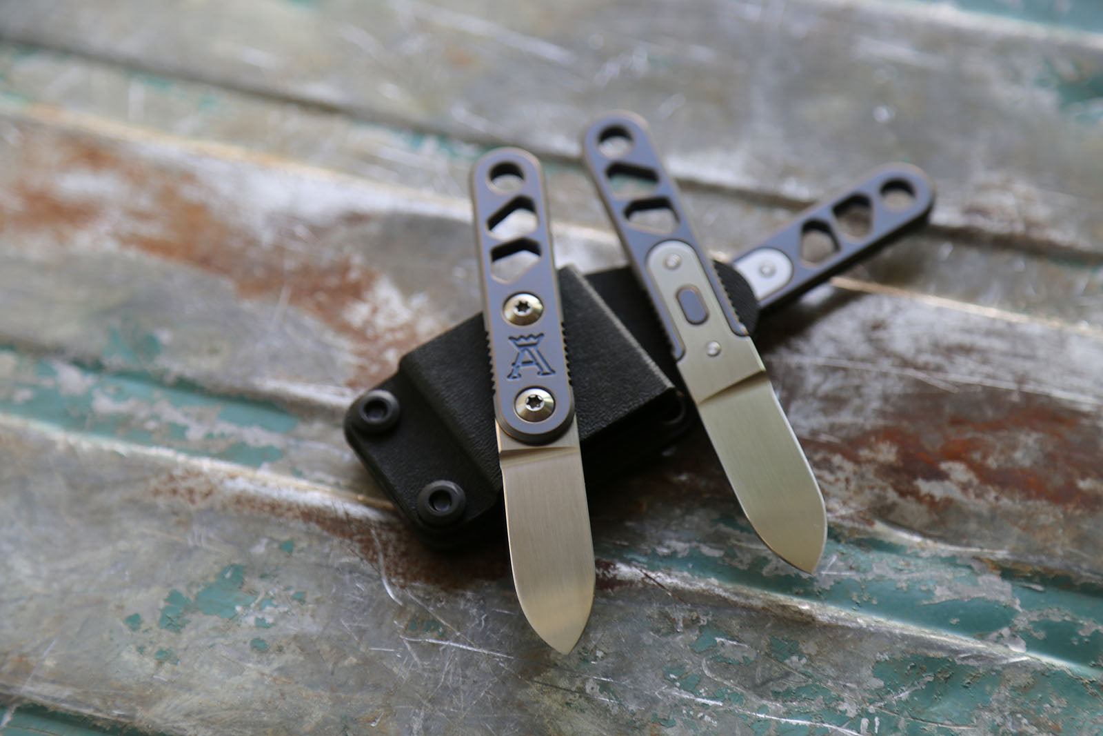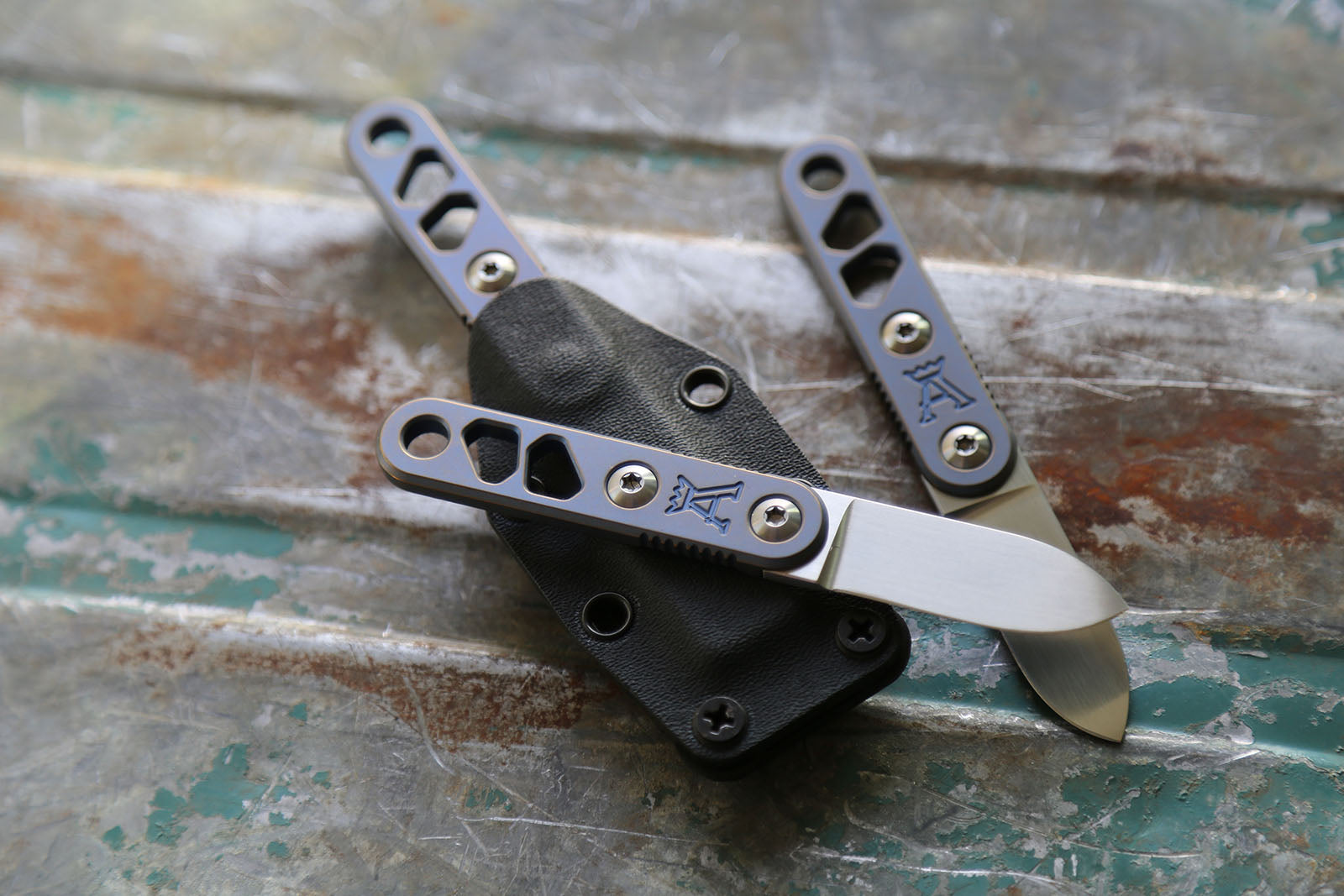 A small utilitarian fixed blade built in a modular design that allows to interchange blades and handles of your liking and need. Transports and stays safe in a small kydex sheath that allows for dropping the knife in the bottom of a jacket pocket, ride on your belt or maybe installing on the hul of your kayak. In short the perfect little blade for whatever you need it for.