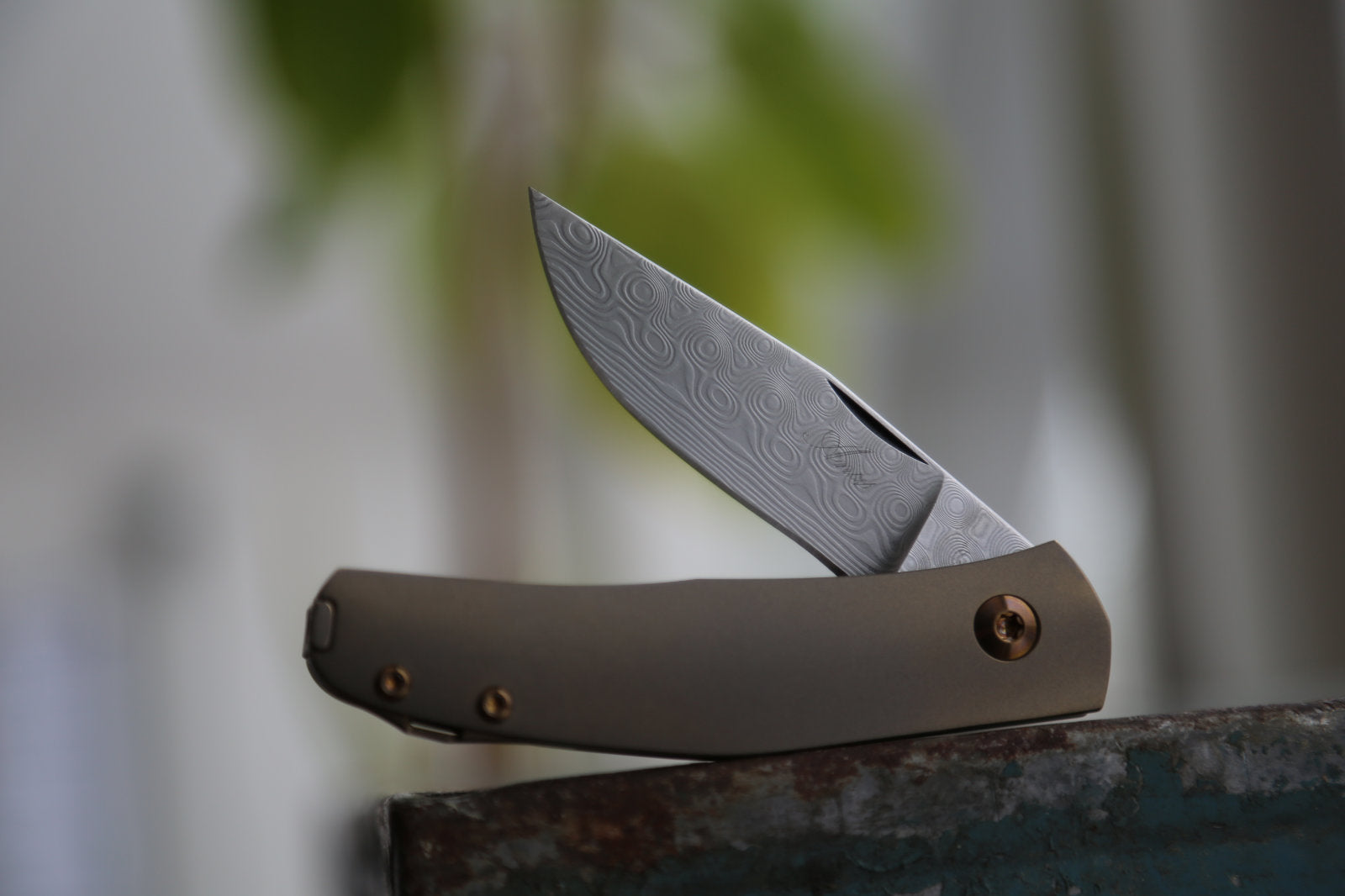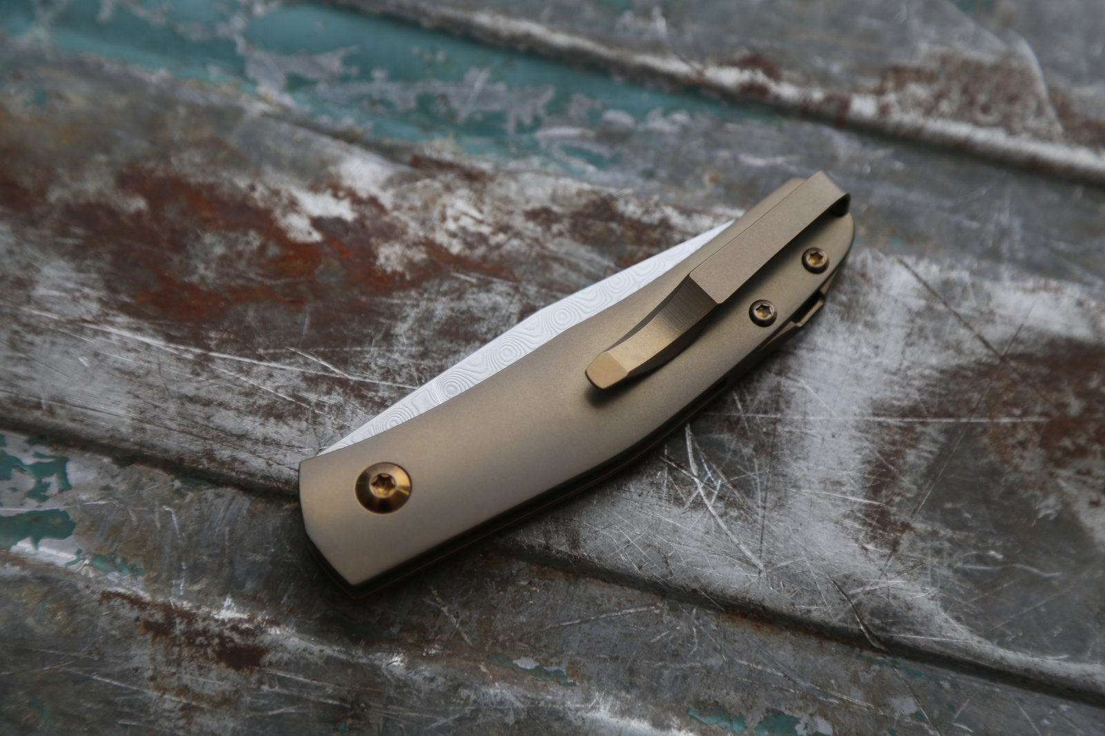 This Casino is made with a nice smooth finish on the amber anodized titanium handle. The blade is made from Damasteel with a ghost finish. Clip, spacer and screws are amber.