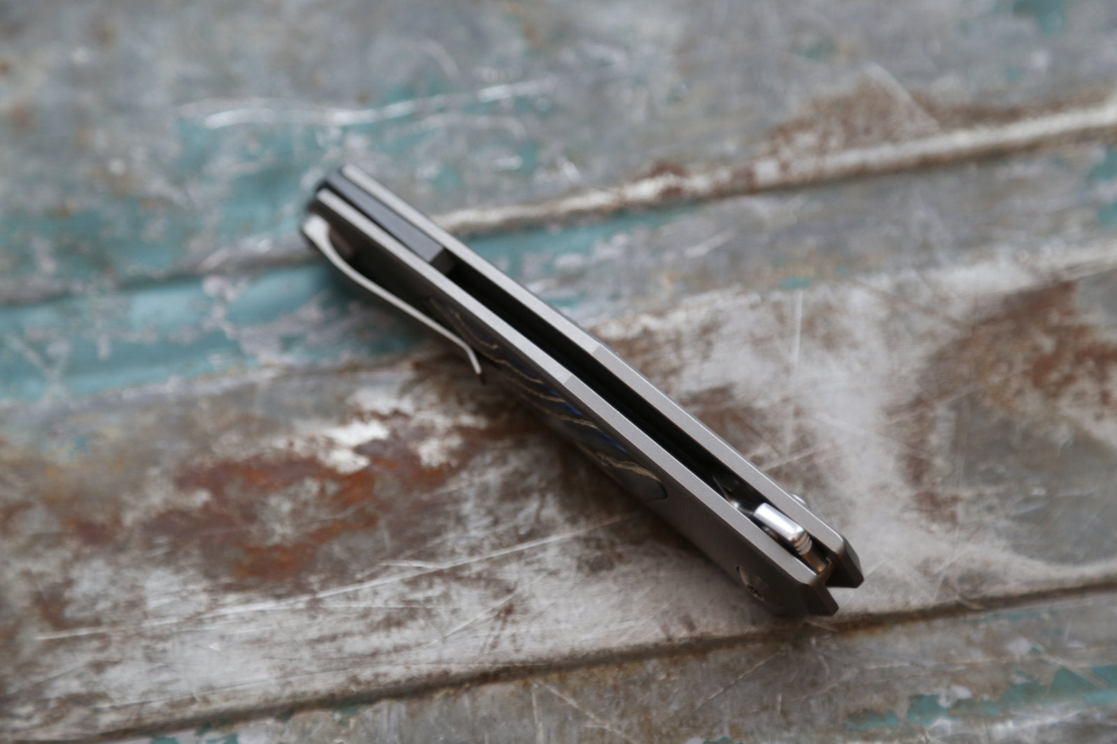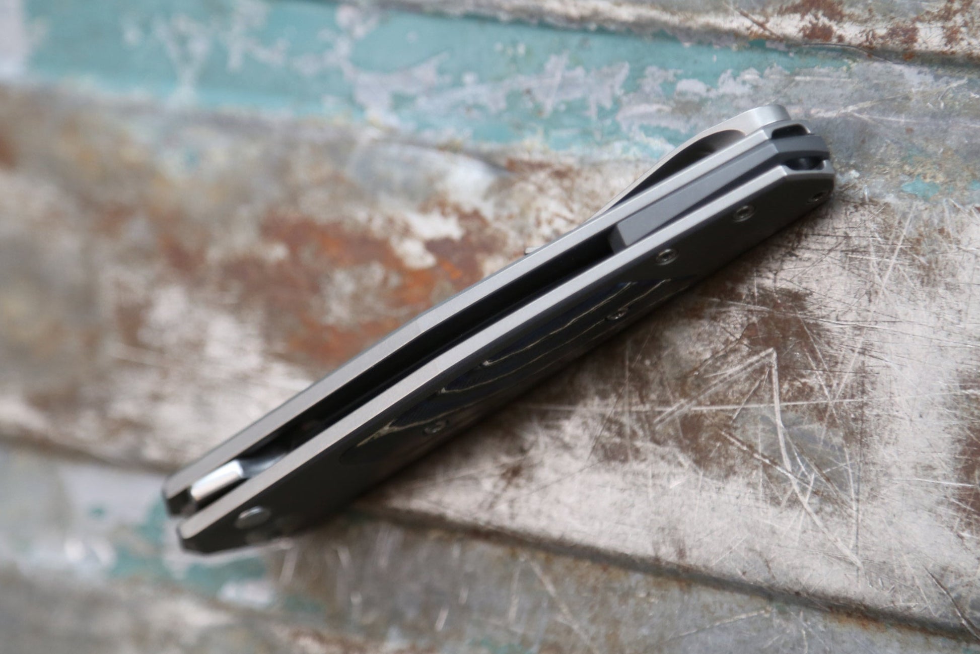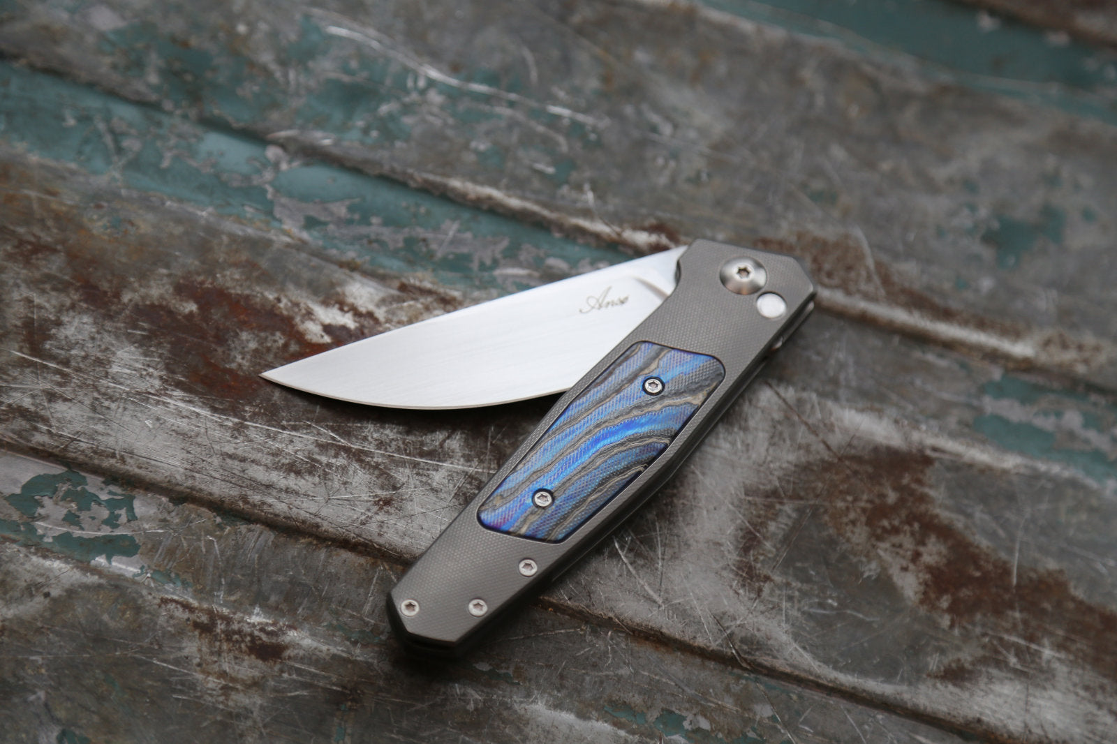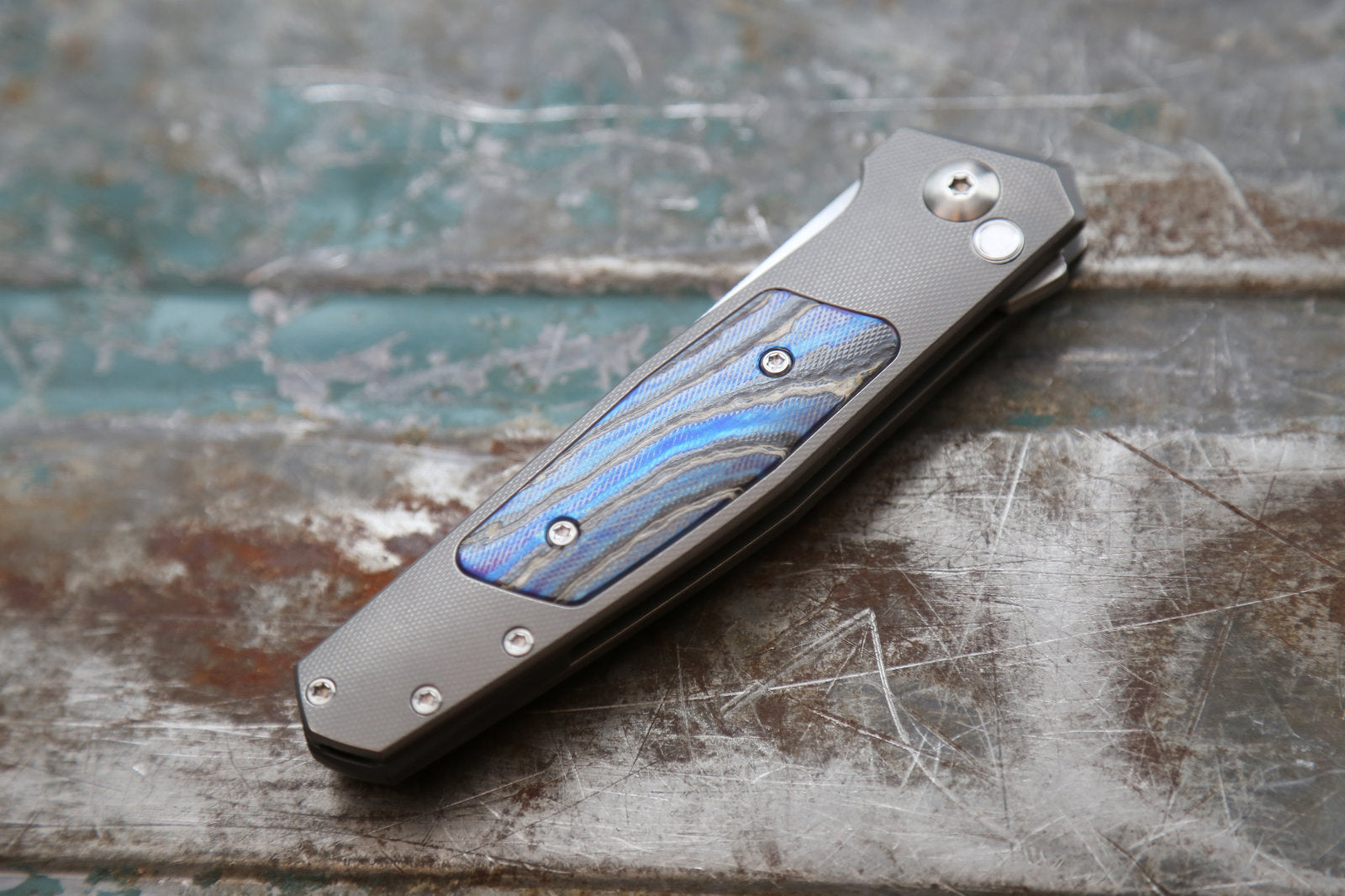 Grey handle, Crystalized titanium/zirconium alloy inlay finished very specially, zirconium spacer, Grey/satin hardware/clip.
