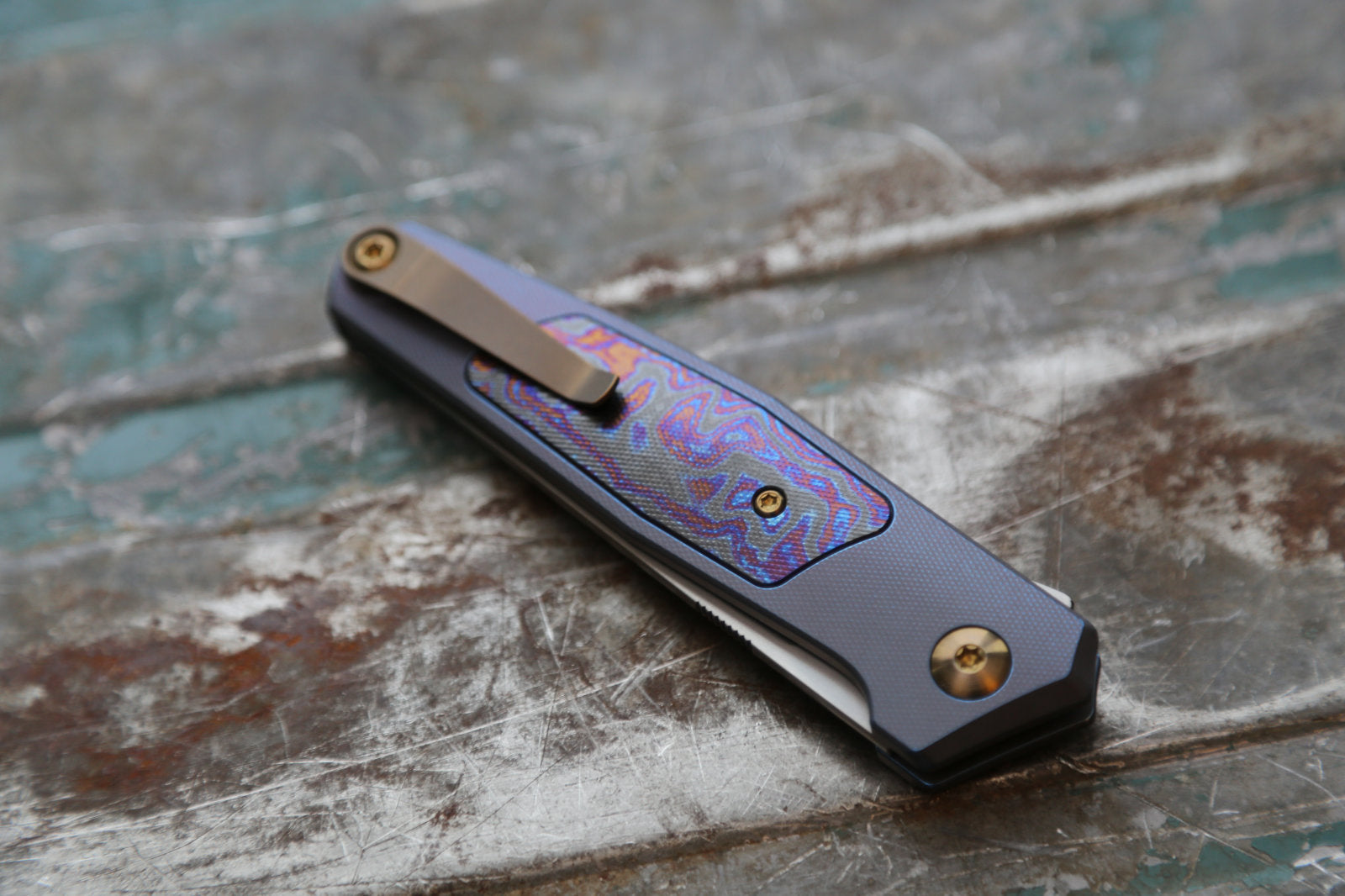 Kobolt variant handle, Black timascus inlay, zirconium spacer, amber hardware/clip.
