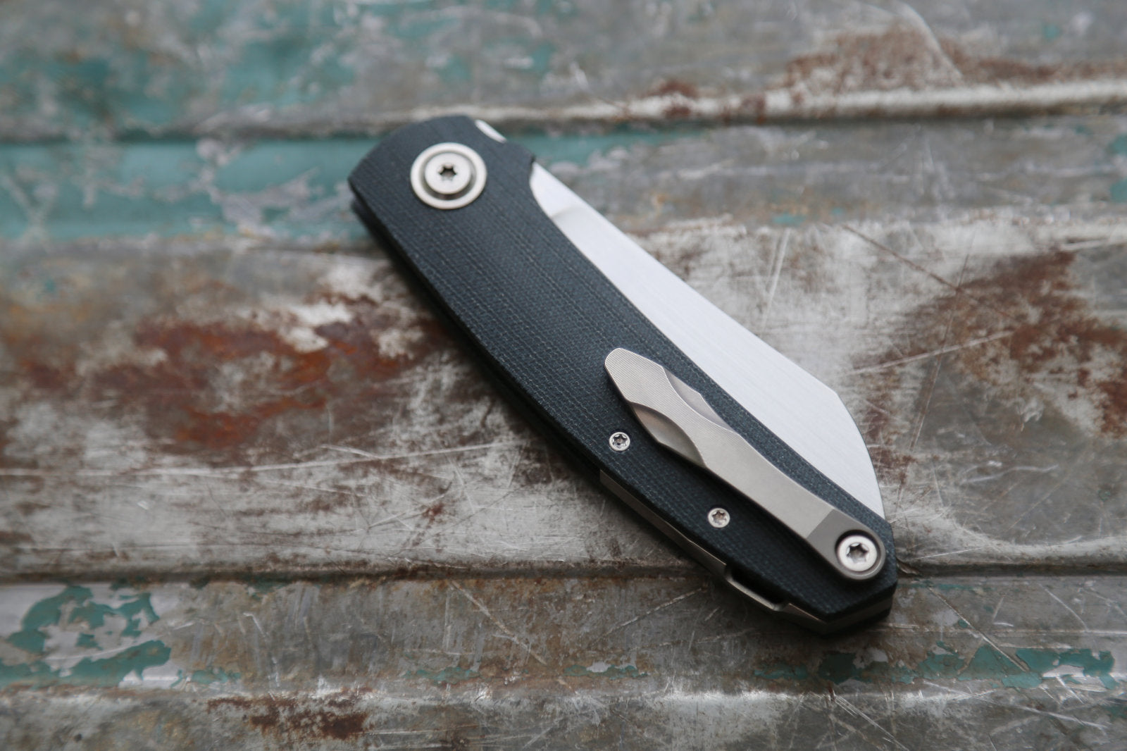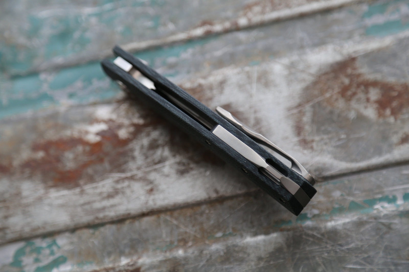 This version is a nested linerlock with hardened lock insert in titanium liners. The handle is denim micarta. The blade in Satin Finished RWL34. The Spacer, clip are grey titanium. Screws and pivot rings in satin titanium.