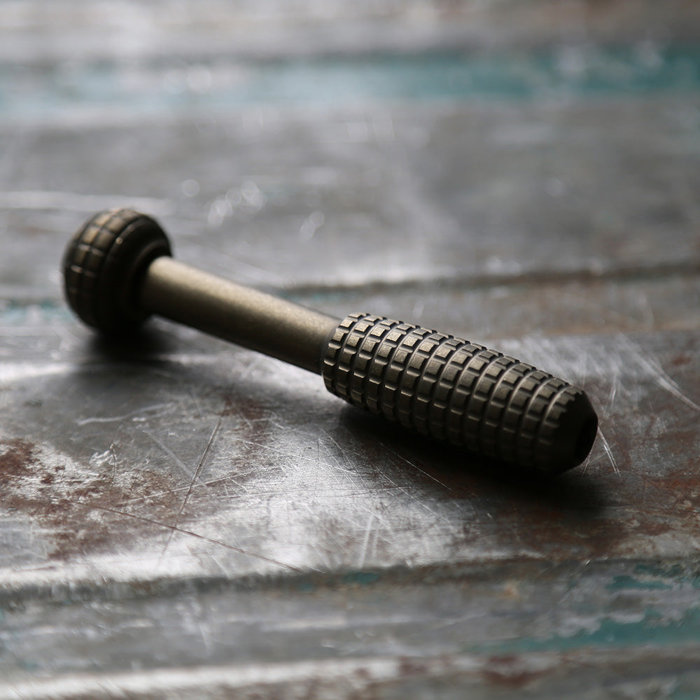 Made from textured titanium, it has a both secure and comfortable grip, that allows for both precision and torque. The spinning head sits on two precision bearings and rests well in the palm of your hand but also offers you to position your index finger tip for precision work. I have used spinning drivers for years in my shop for putting my knives together and these drivers are designed with this knowledge in mind. I designed this great little tool for Audcious Concepts in Finland, who had them made. I customized the CUPRUM and KOBOLT versions.