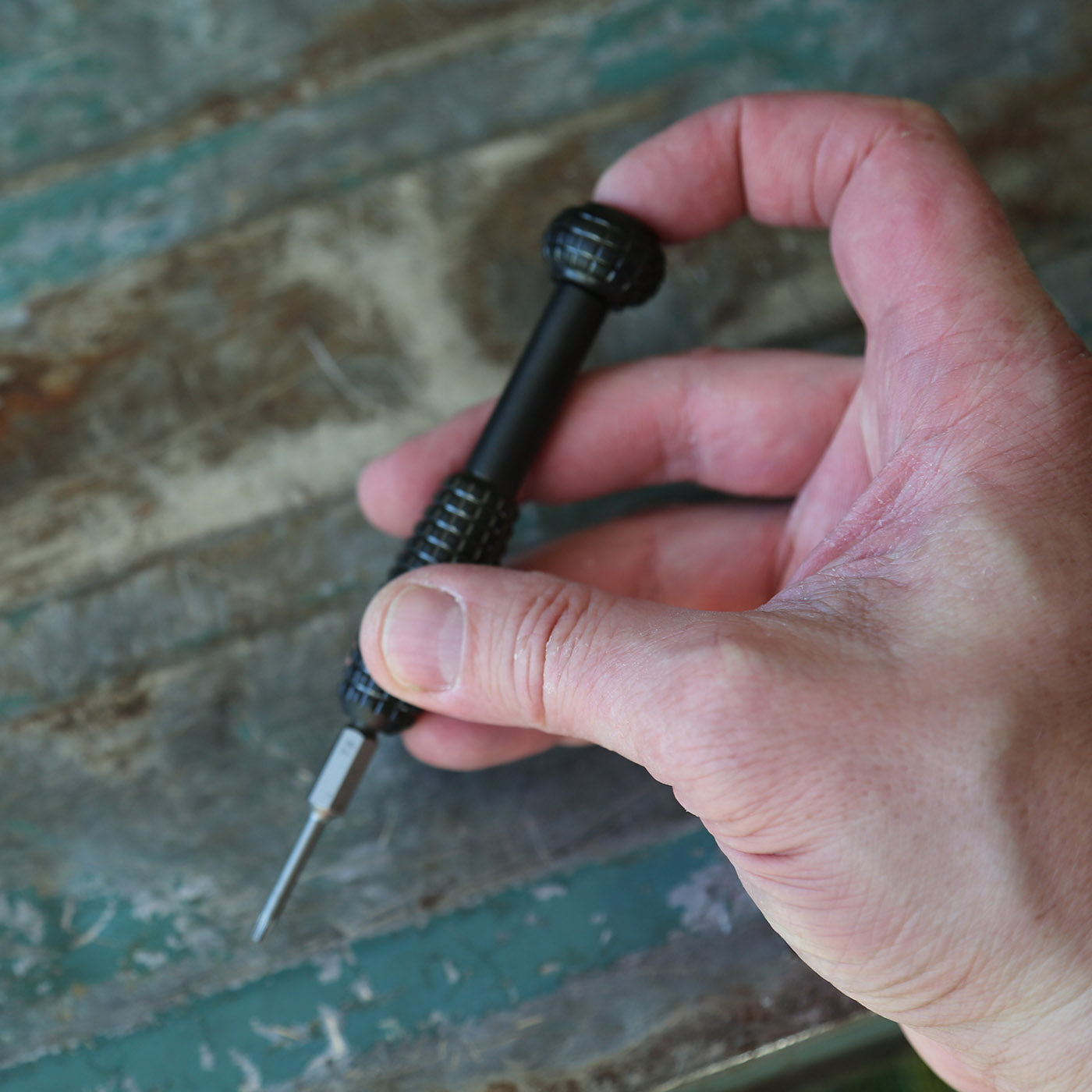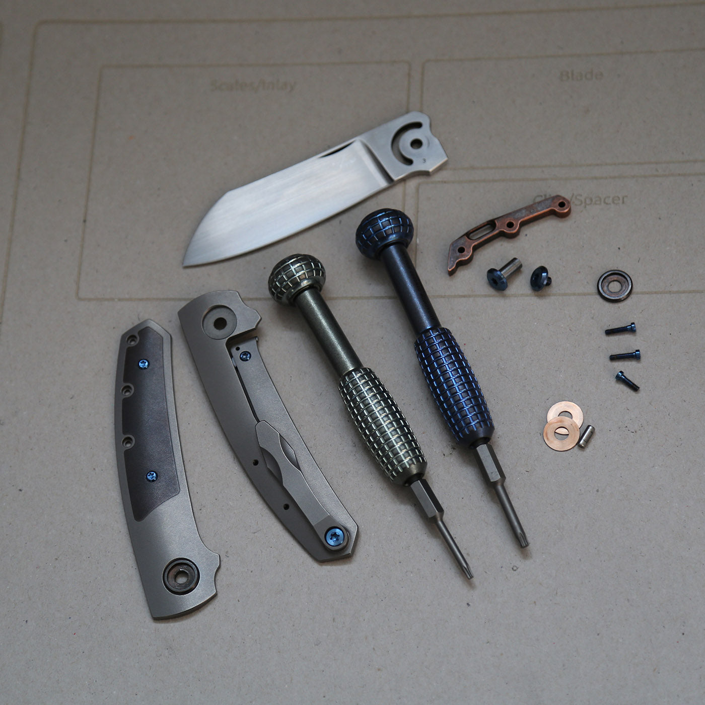Made from textured titanium, it has a both secure and comfortable grip, that allows for both precision and torque. The spinning head sits on two precision bearings and rests well in the palm of your hand but also offers you to position your index finger tip for precision work. I have used spinning drivers for years in my shop for putting my knives together and these drivers are designed with this knowledge in mind. I designed this great little tool for Audcious Concepts in Finland, who had them made. I customized the CUPRUM and KOBOLT versions.
