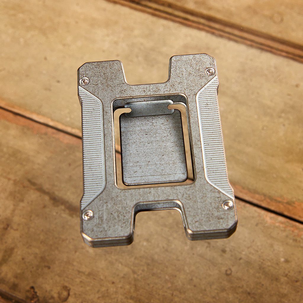 The Matrix is a small pocket sized credit card holder that has the ability to hold as few as one or as many as 6 cards using a top-facing tensioned titanium spring. (also works great for business cards).