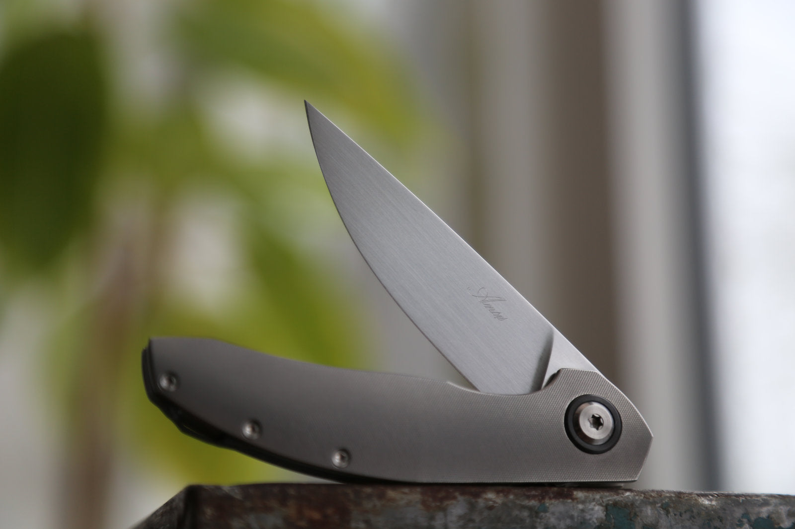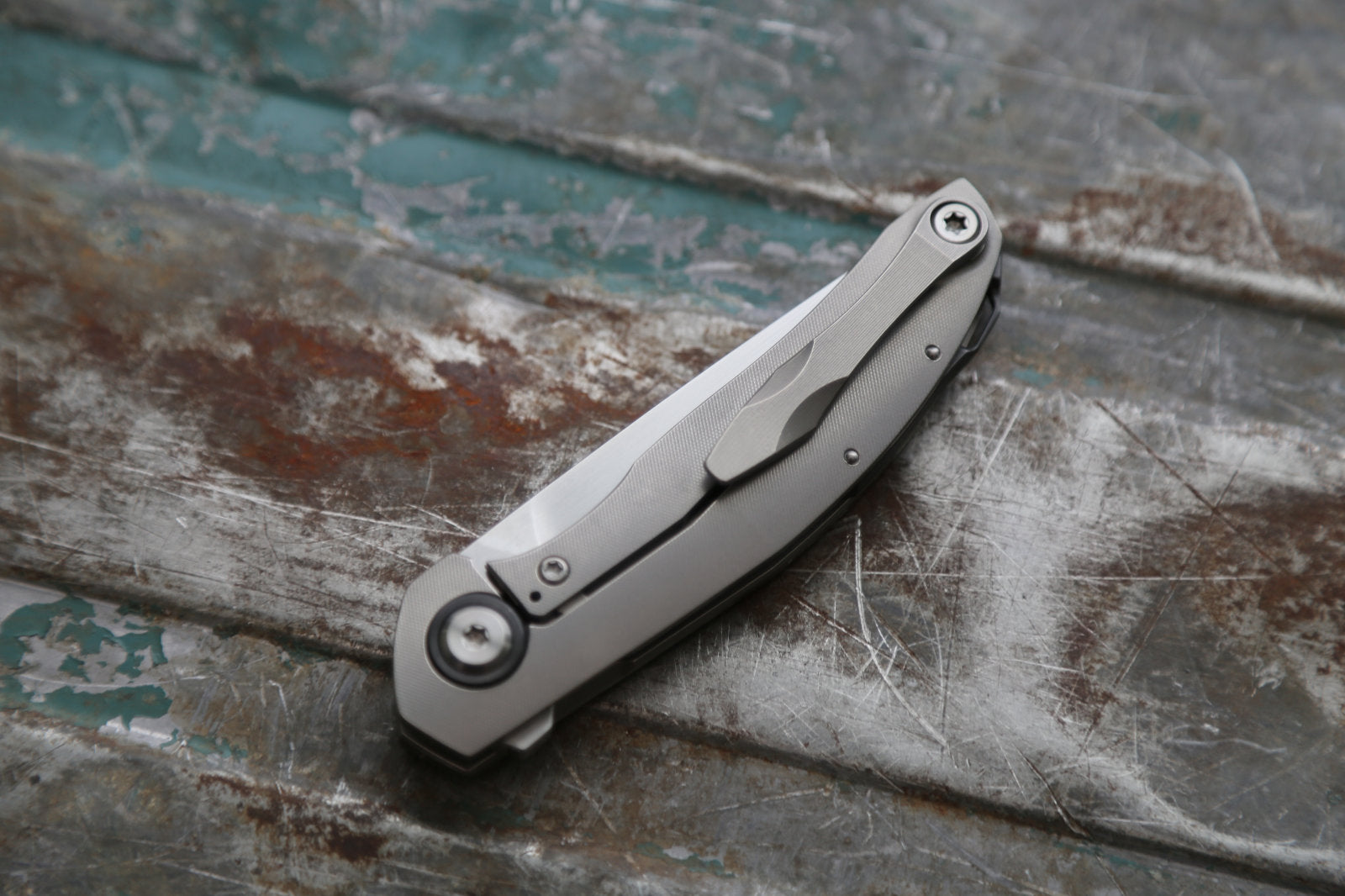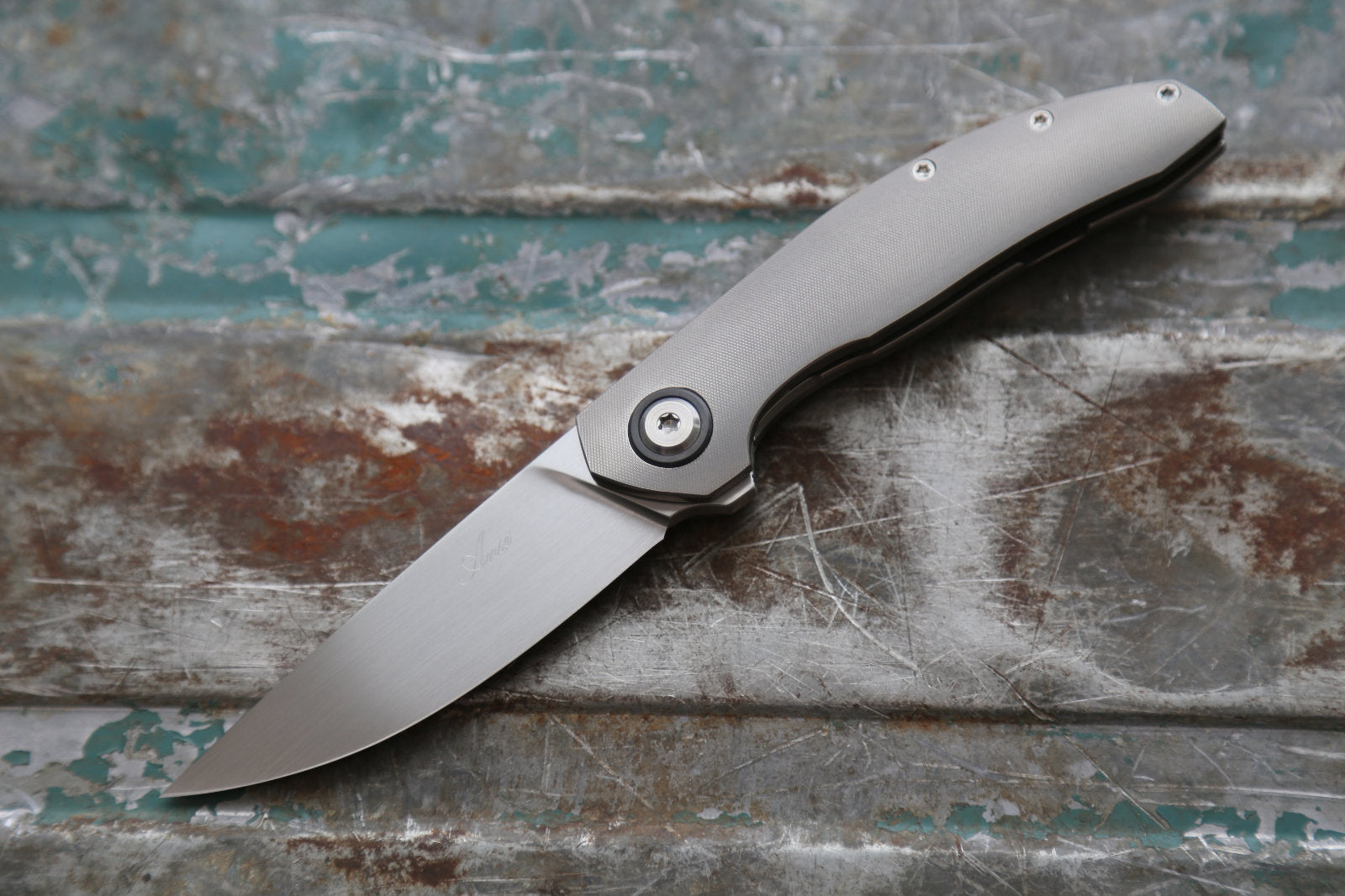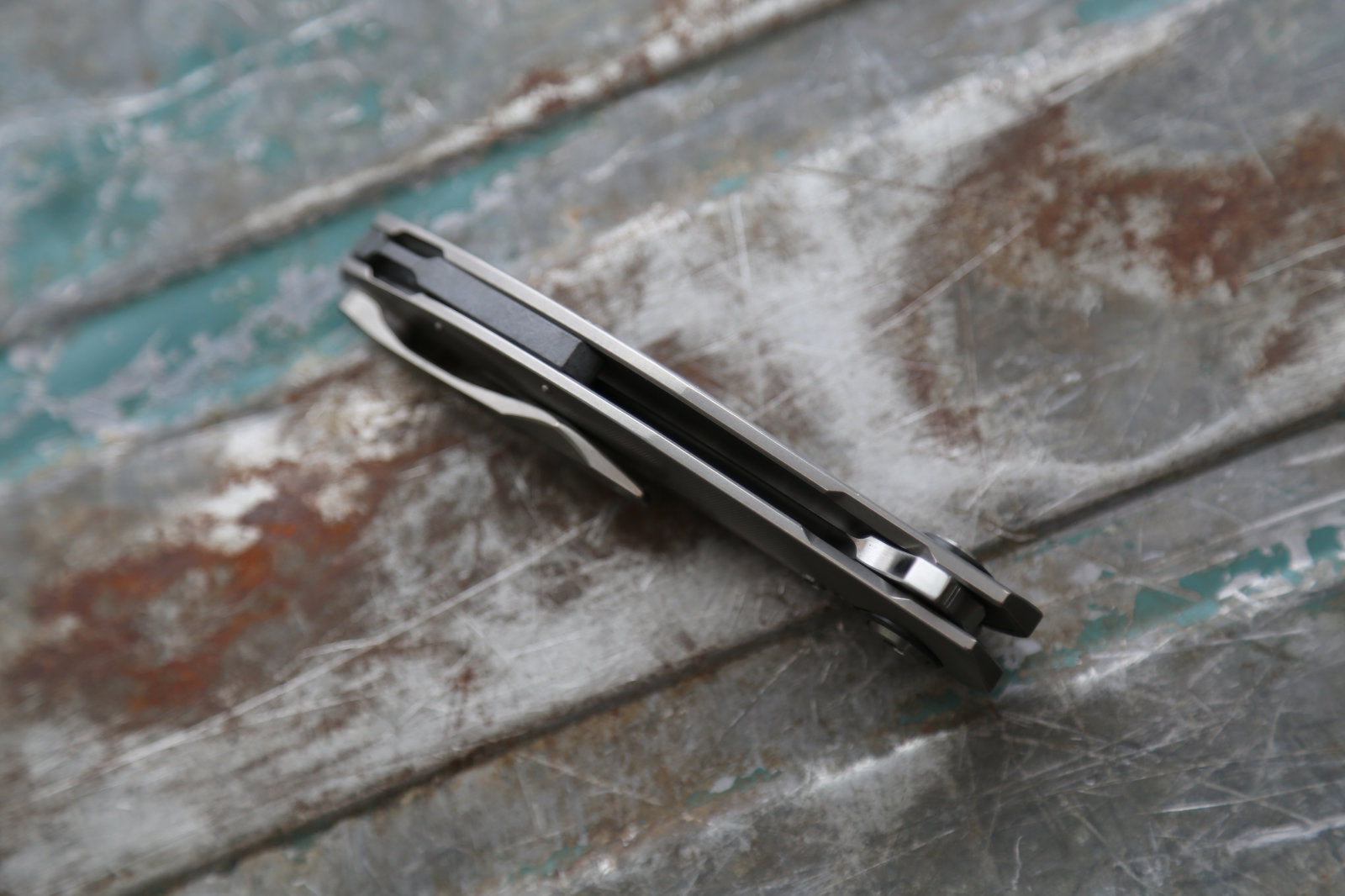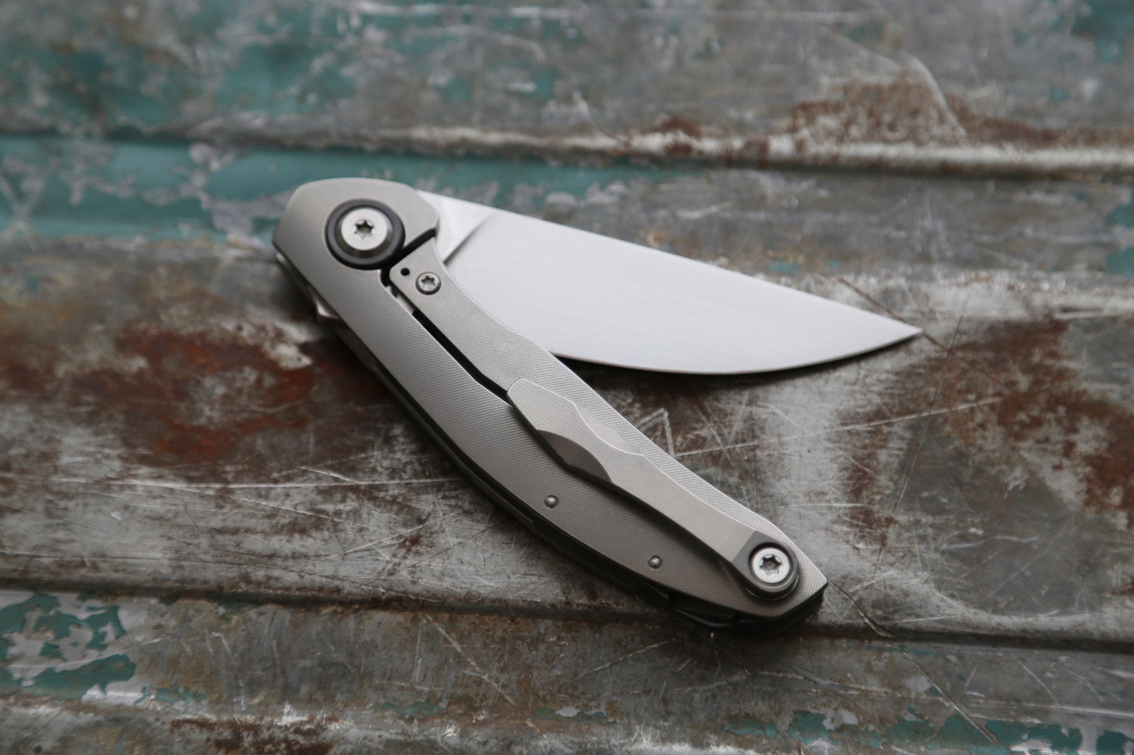 This particular ORSO has a satin finished RWL34 blade. The titanium frame and clip are grey. Backspacer and pivot rings in Zirconium. The screws are satin titanium.