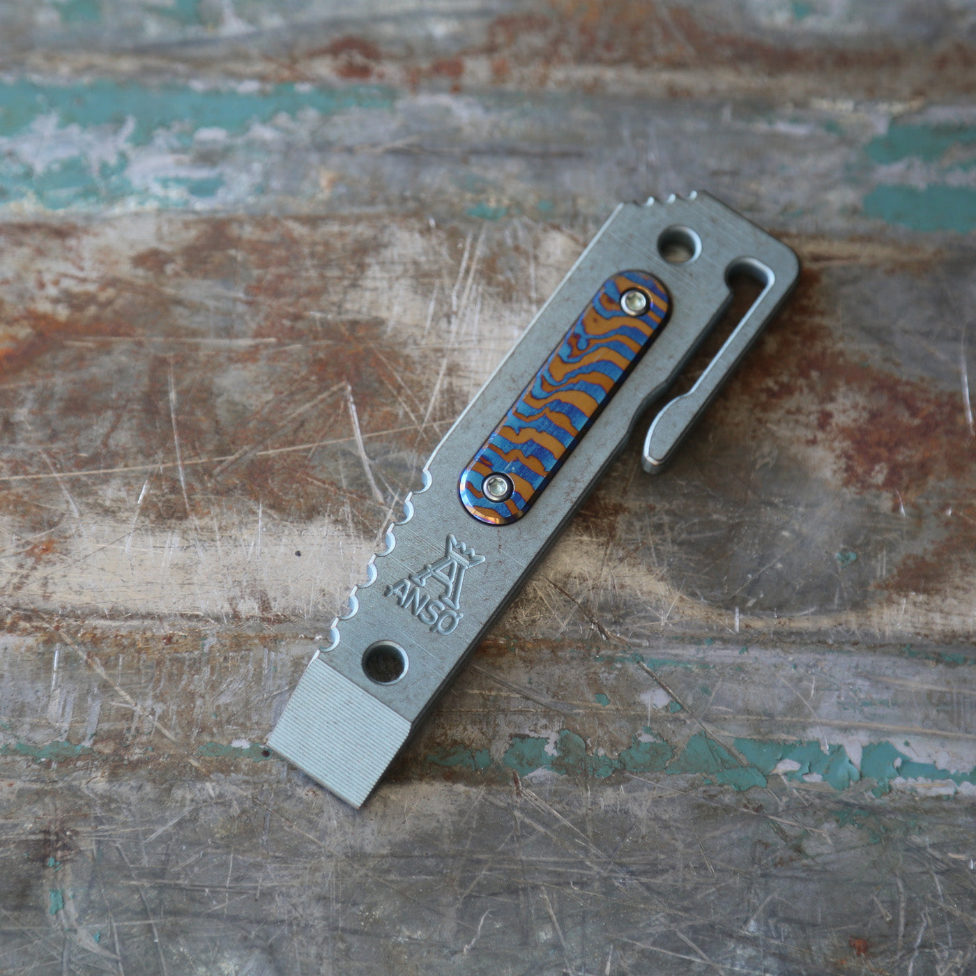 This new version of the Anso tool classic features single sided inlay in a variation of metals. Attached with titanium screws that can be anodized to match the color of the prybar. The Prybar12 have been beadblasted, stonewashed and anodized.