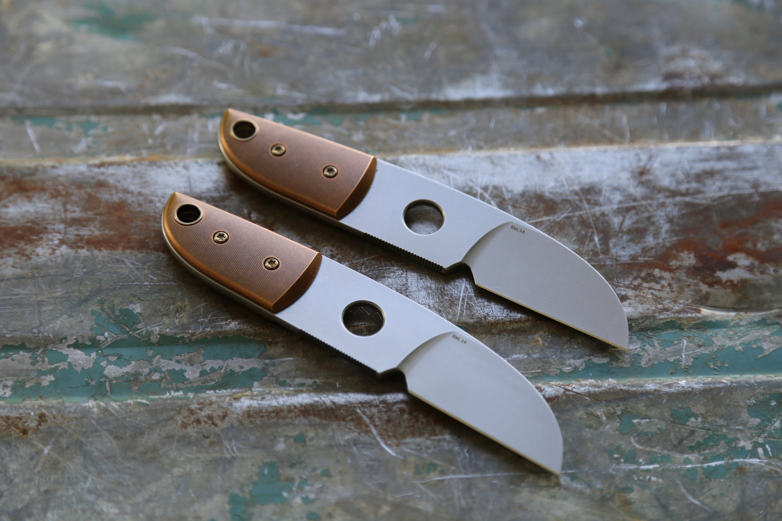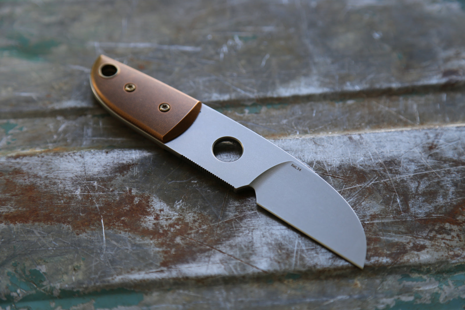 These are a new version of the more than 25 year old design. We upgraded the blade with a hollow ground blade and added a sharpening choil. The knife comes with a Tuskan belt/pocket leather sheath. 2 available in this configuration. Scales are in Bronze.