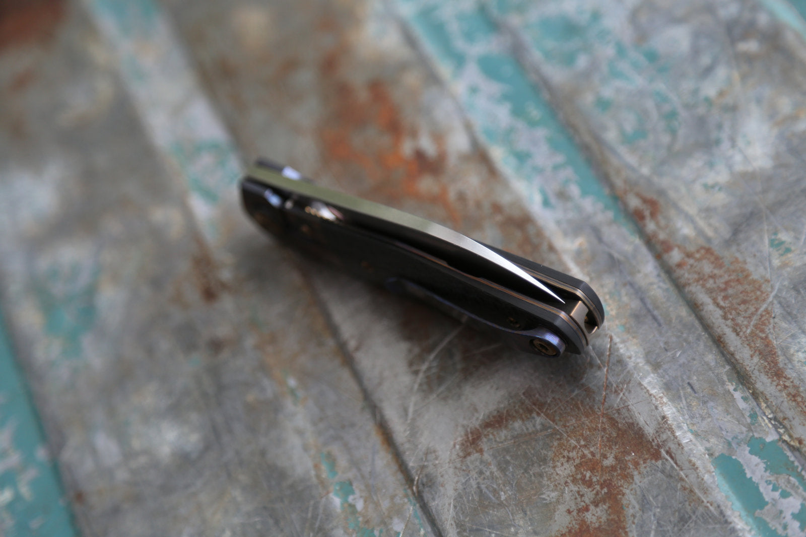 The Sonic features the trademarked Spyderco opening hole that I am licensed to use. The construction is a bolster lock which is the first time ever that I use this mechanism. The lock has a hardened steel lock insert. The handle/spacer feartures one of my unique lanyard holes that only pierce one handle side and exits in the end of the spacer. The lanyard “tube” is integral to the liner, milled out of a solid chunk titanium. The clip is my now signature 3D milled and bent clip. The blade is full flat ground.