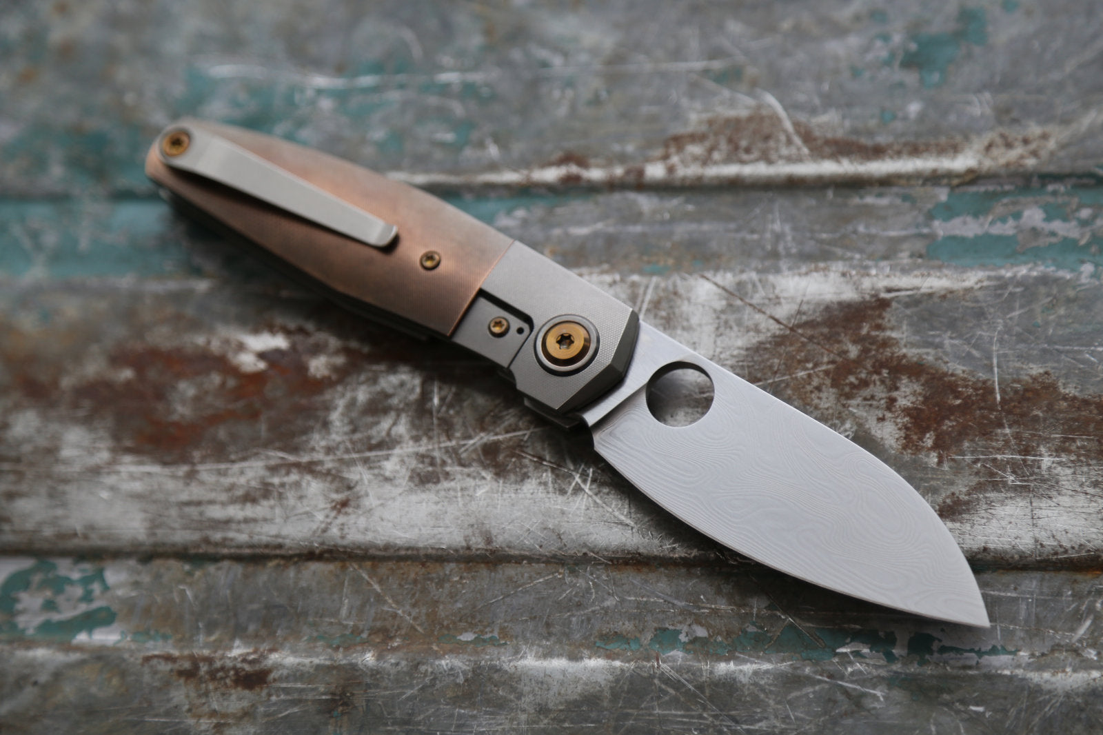 This particular Sonic features a Blade in Ghost finished Damasteel Damascus with bronze scales and pivot rings over a grey titanium frame. The clip and Spacer are also grey titanium and the titanium screws are anodized amber.