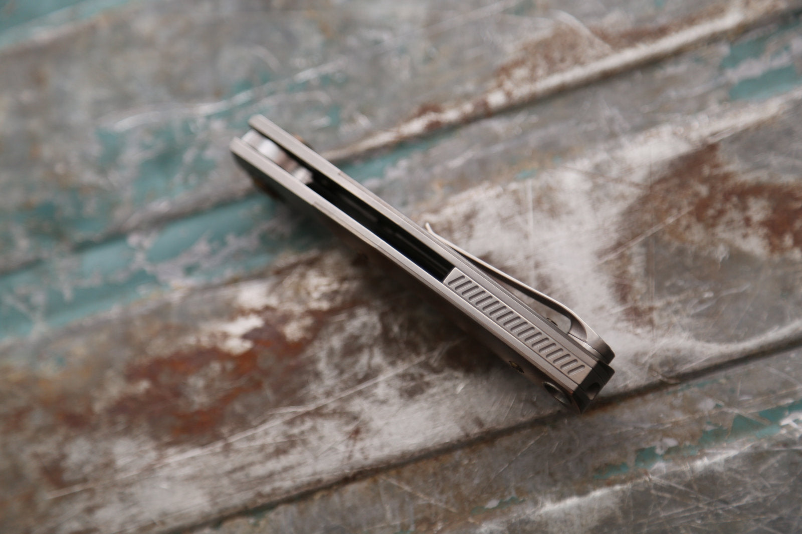 The Sonic features the trademarked Spyderco opening hole that I am licensed to use. The construction is a bolster lock which is the first time ever that I use this mechanism. The lock has a hardened steel lock insert. The handle/spacer feartures one of my unique lanyard holes that only pierce one handle side and exits in the end of the spacer. The lanyard “tube” is integral to the liner, milled out of a solid chunk titanium. The clip is my now signature 3D milled and bent clip. The blade is full flat ground.