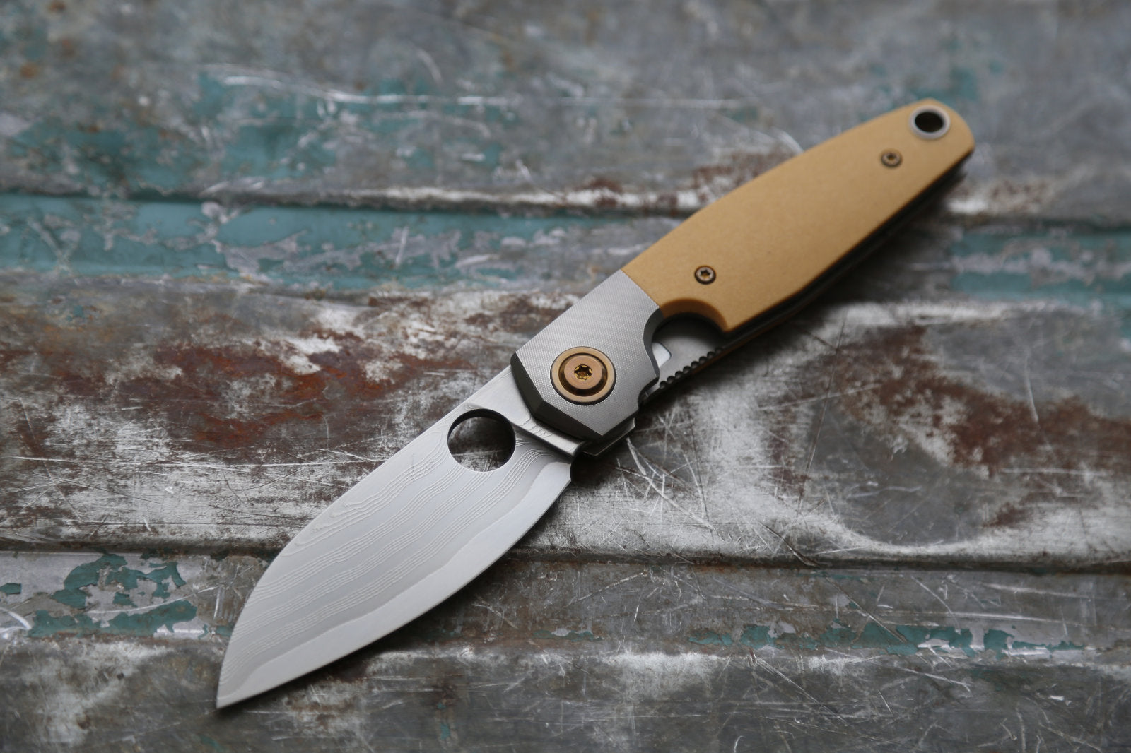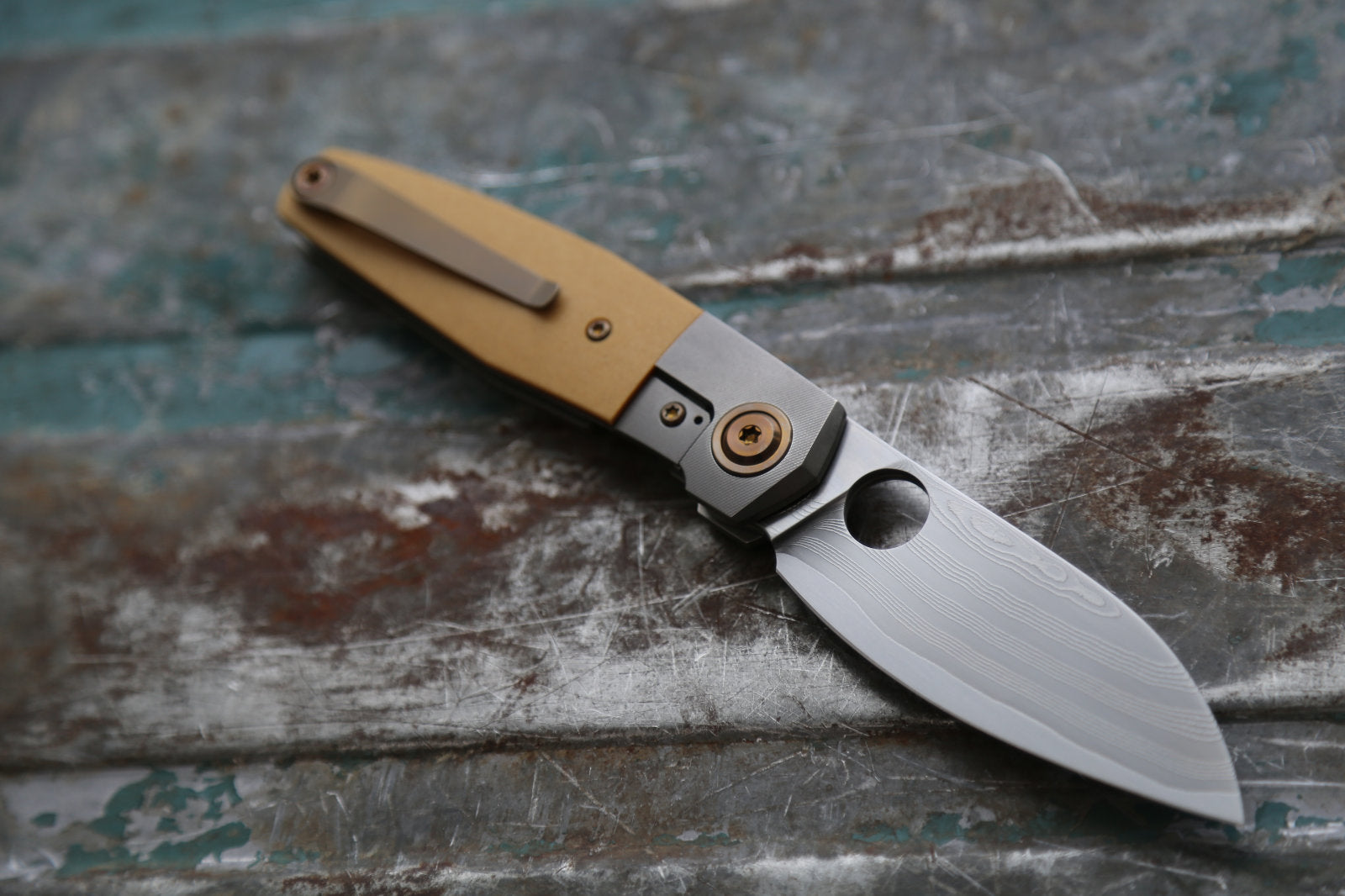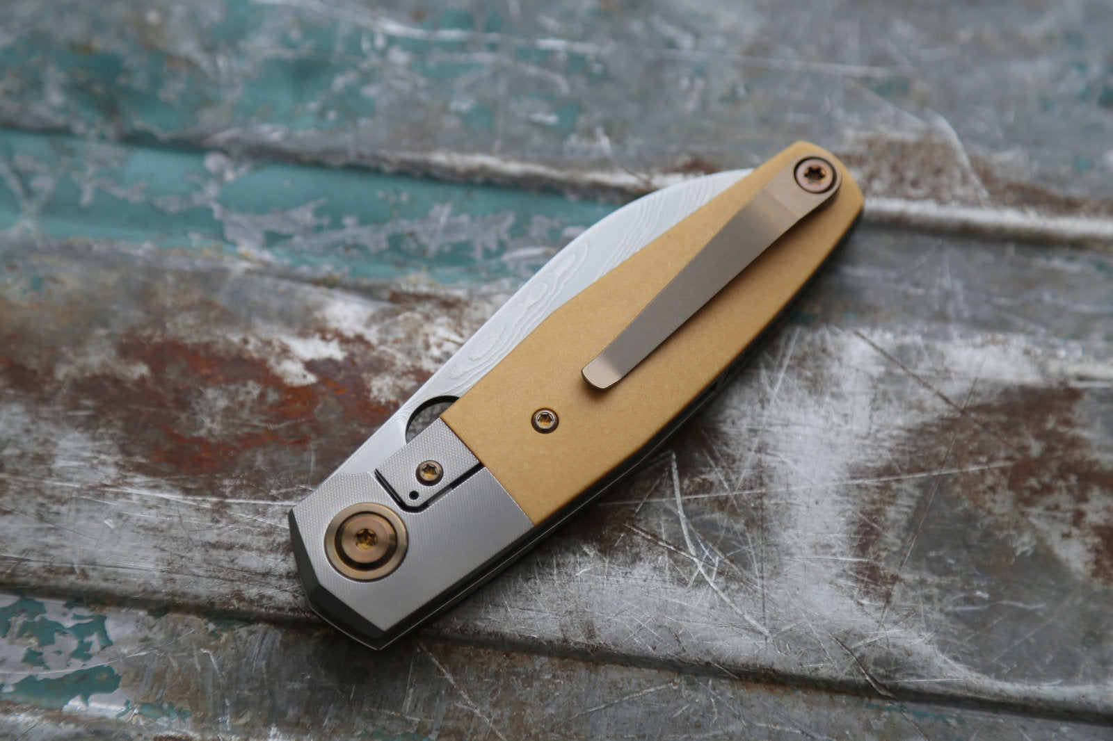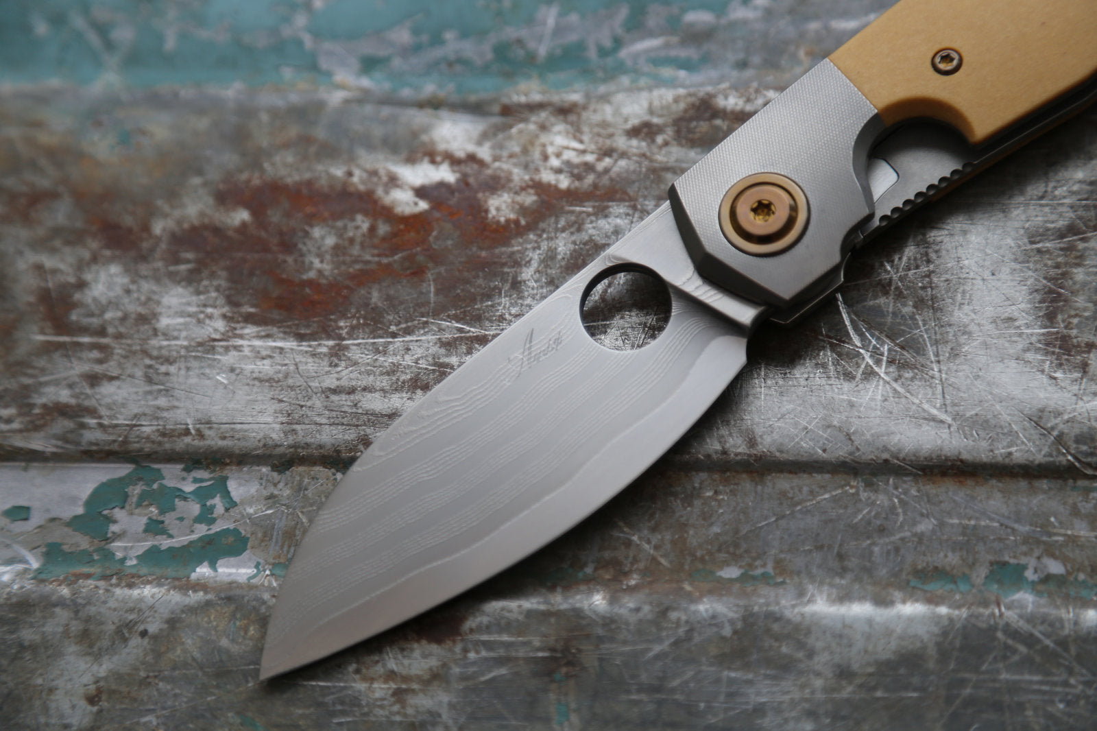 This particular Sonic features a Blade in Chad Nichols Armor Core Damascus with vintage Westinghouse ivorite micarta scales over frame in grey titanium. The clip, Spacer, pivot rings and titanium screws are anodized amber.