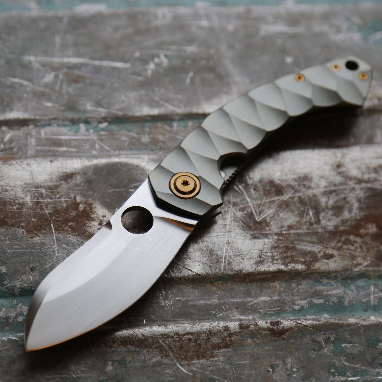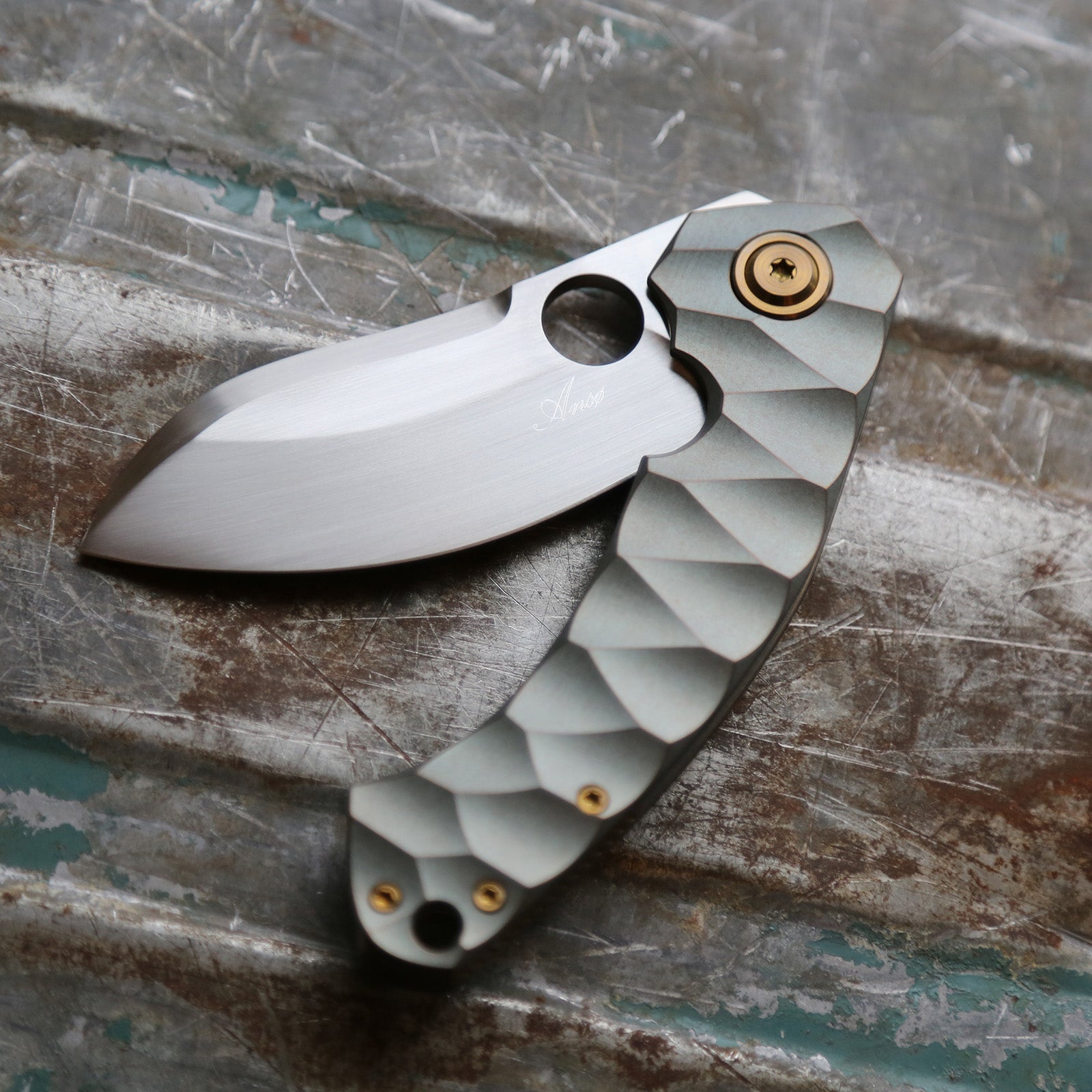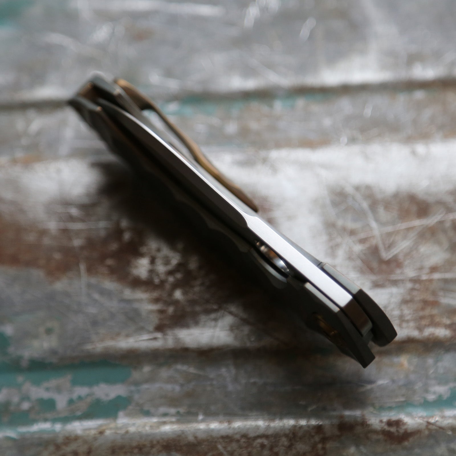 A few key elements in this build. Double swedge grind. Hardened steel lock insert. Titanium screws. Anso texture on the show side. Contoured lock side. Sculpted clip. Milled grooves in spacer.