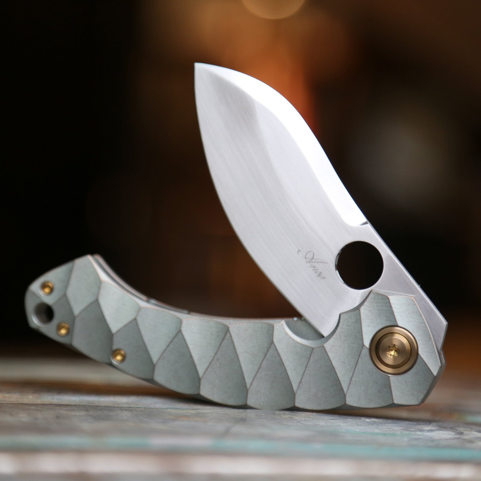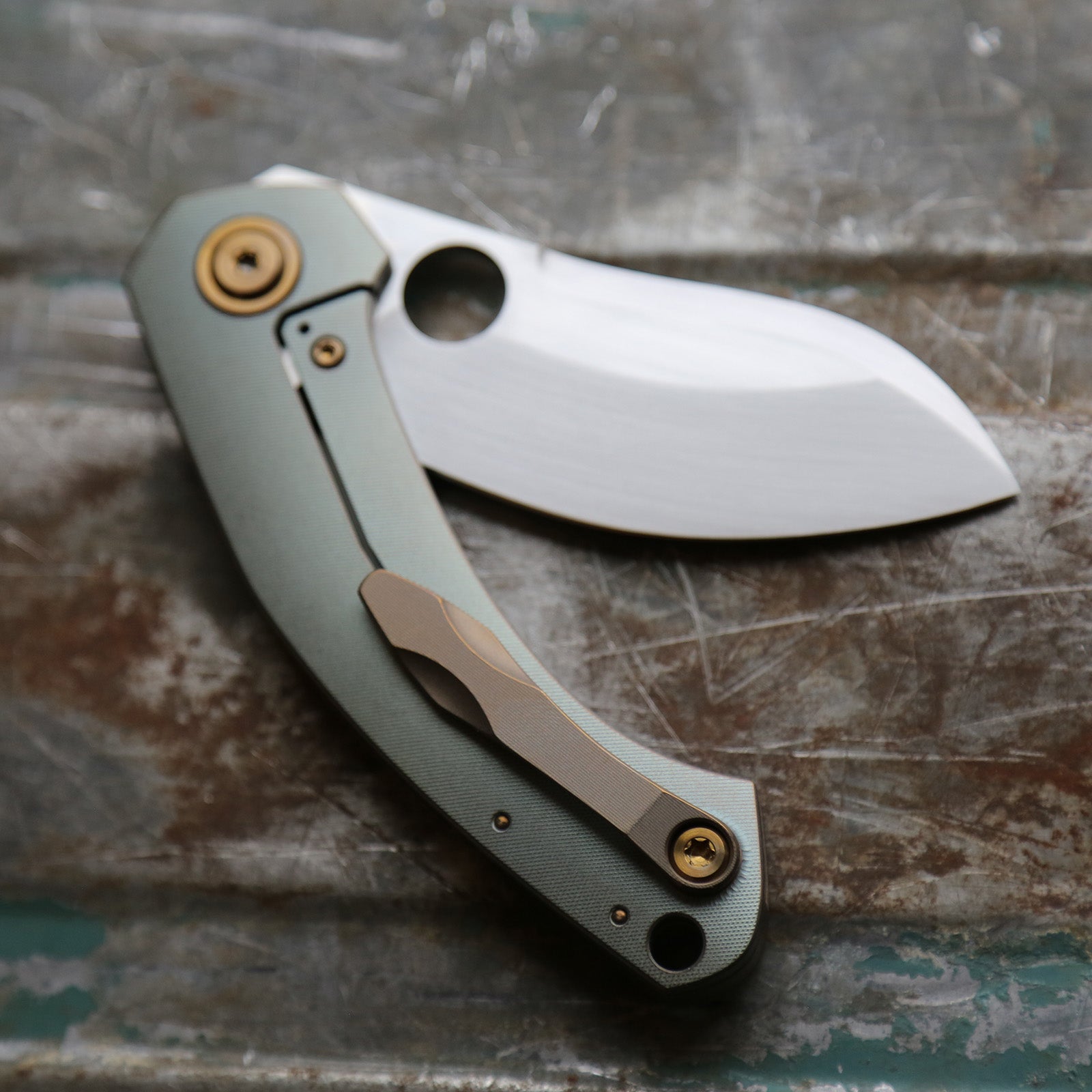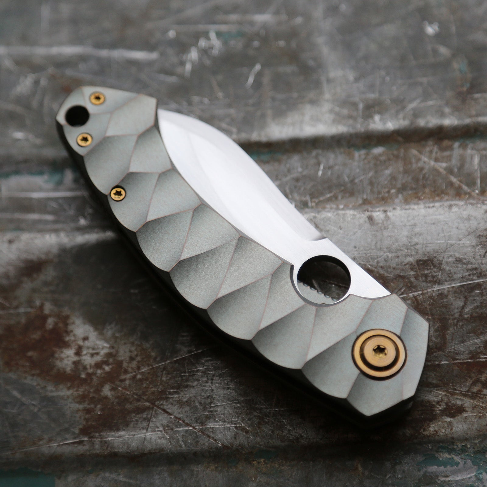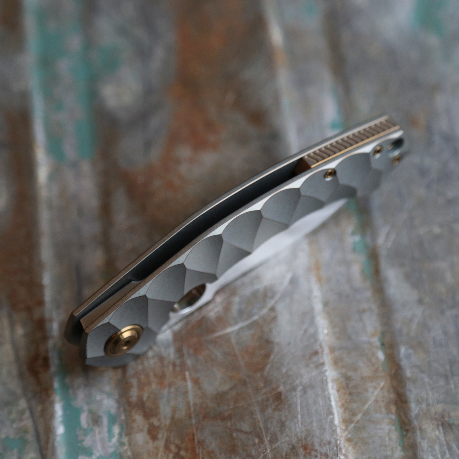 A few key elements in this build. Double swedge grind. Hardened steel lock insert. Titanium screws. Anso texture on the show side. Contoured lock side. Sculpted clip. Milled grooves in spacer.