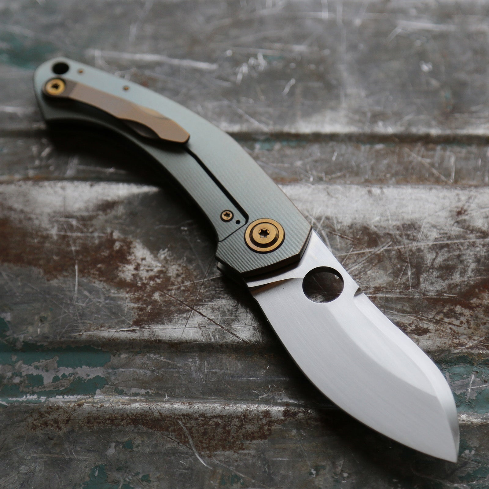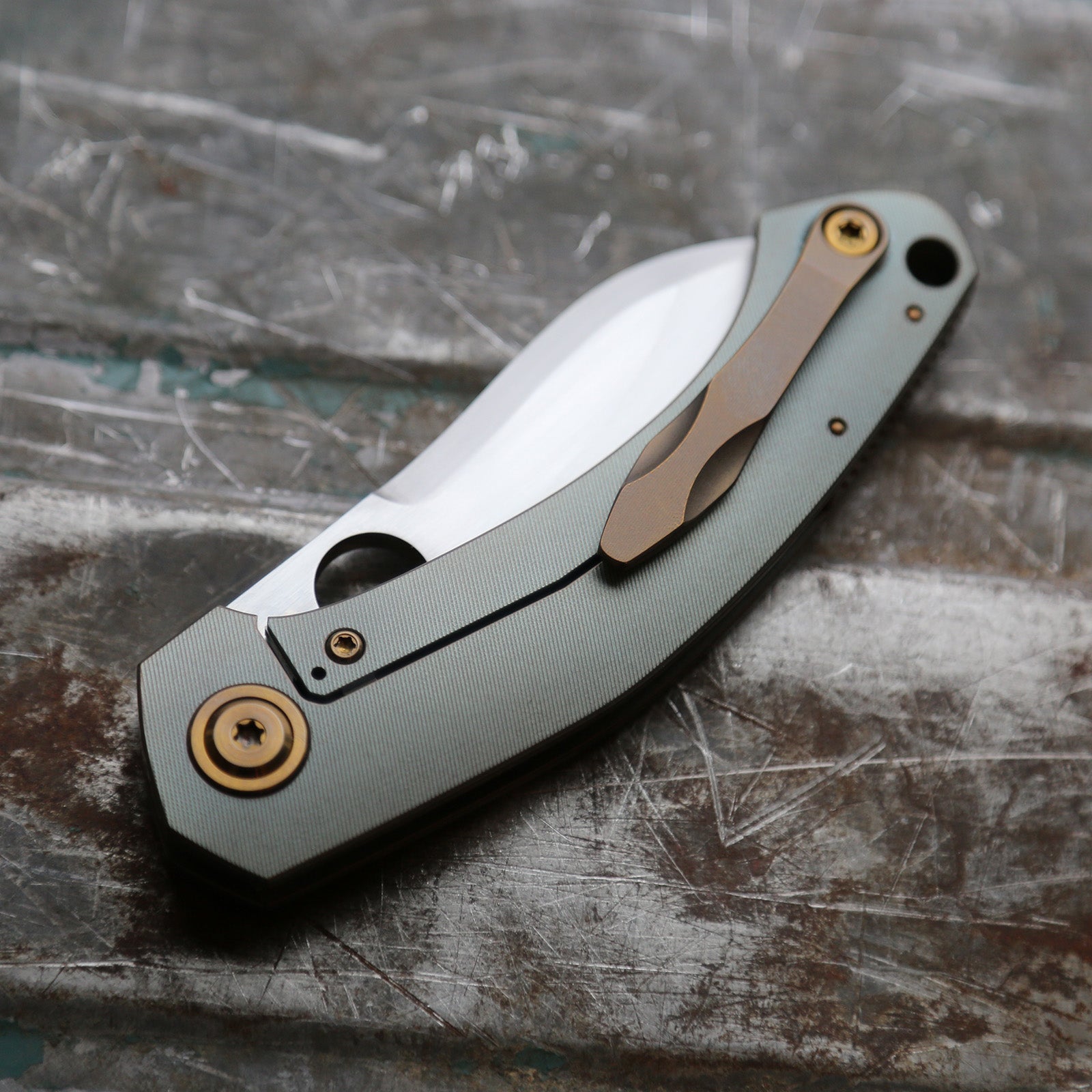 This particular version is made with Satin Finished RWL34 blade, CUPRUM anodized frame, Amber anodized clip, spacer, screws and pivot rings.